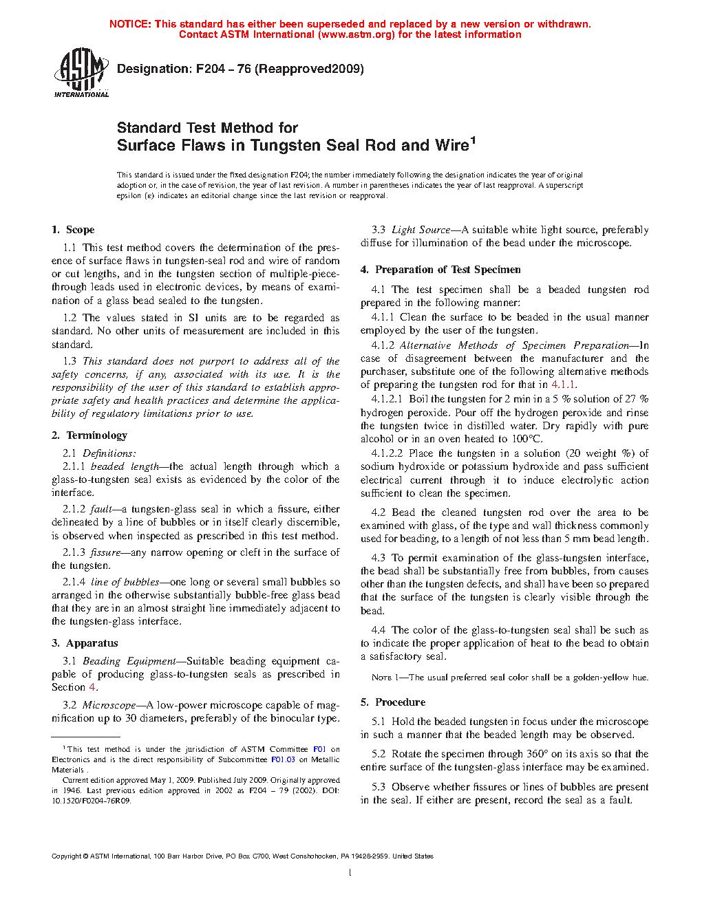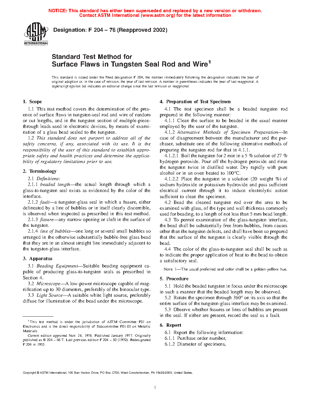 1.1 This test method covers the determination of the presence of surface flaws in tungsten-seal rod and wire of random or cut lengths, and in the tungsten section of multiple-piece-through leads used in electronic devices, by means of examination of a glass bead sealed to the tungsten.