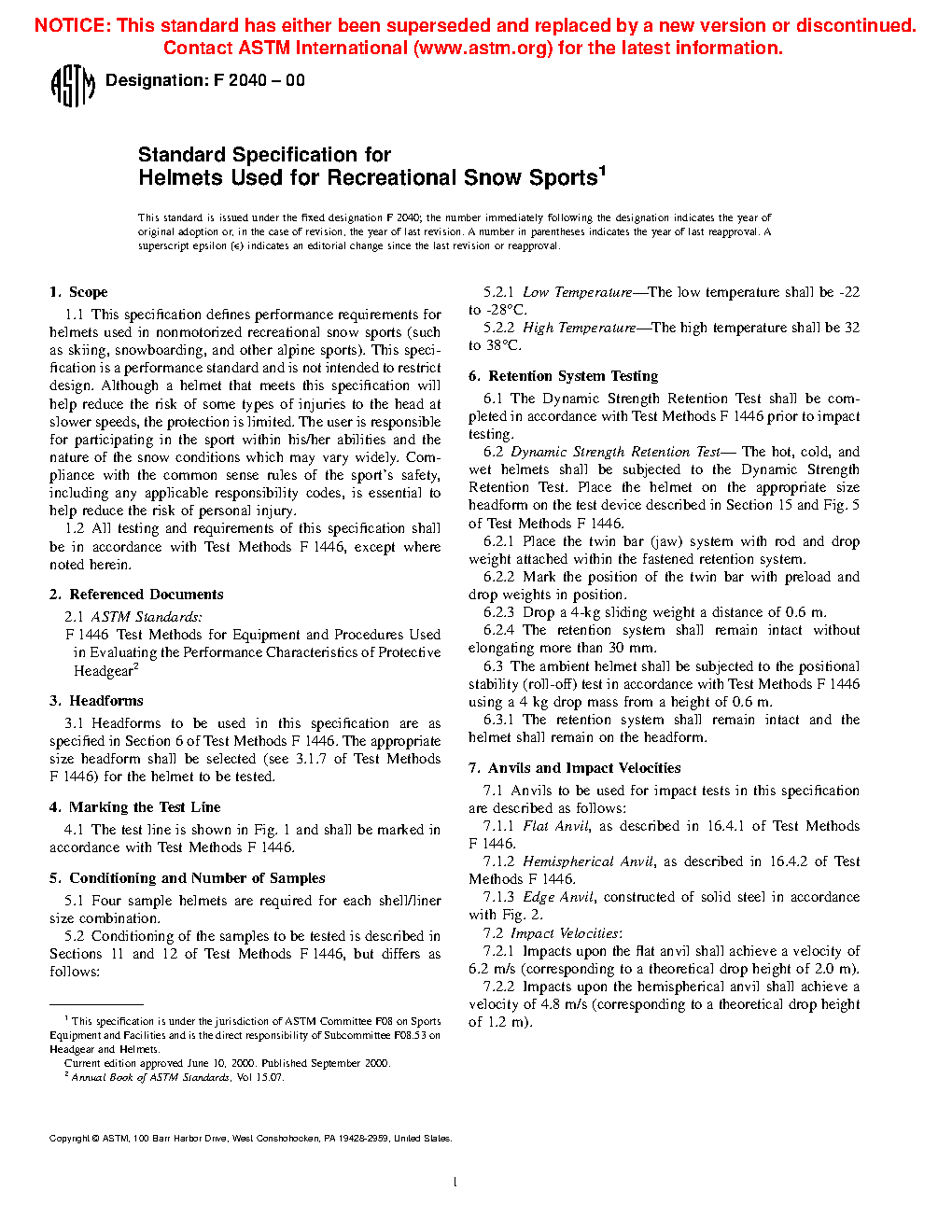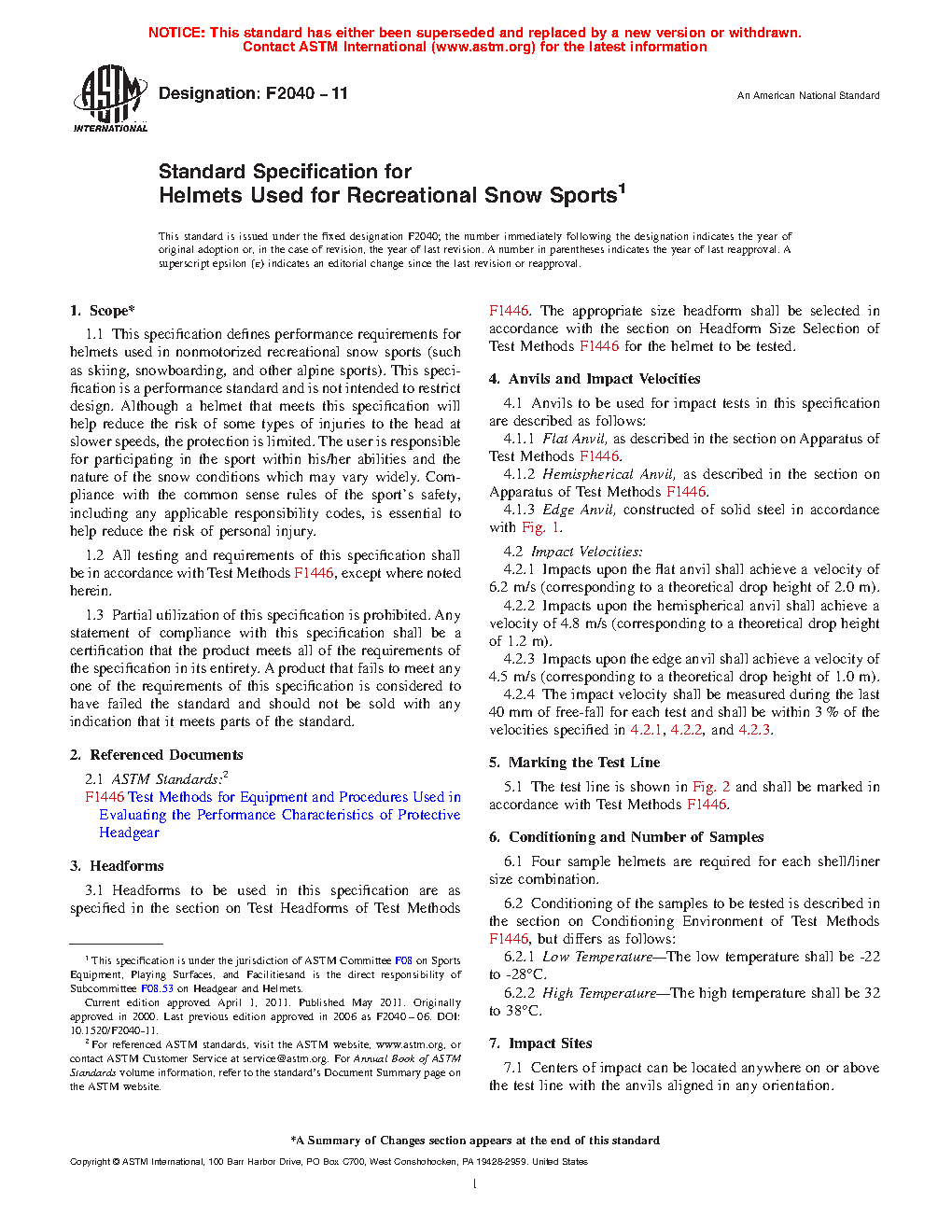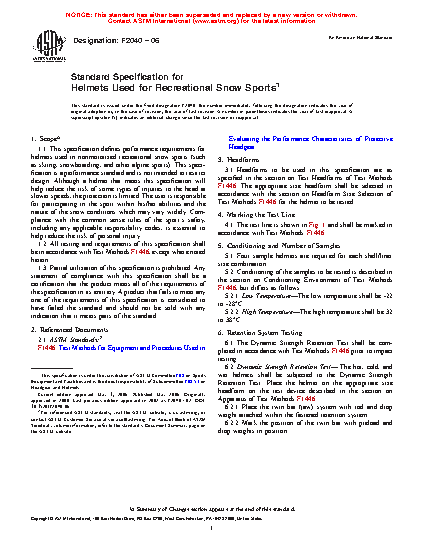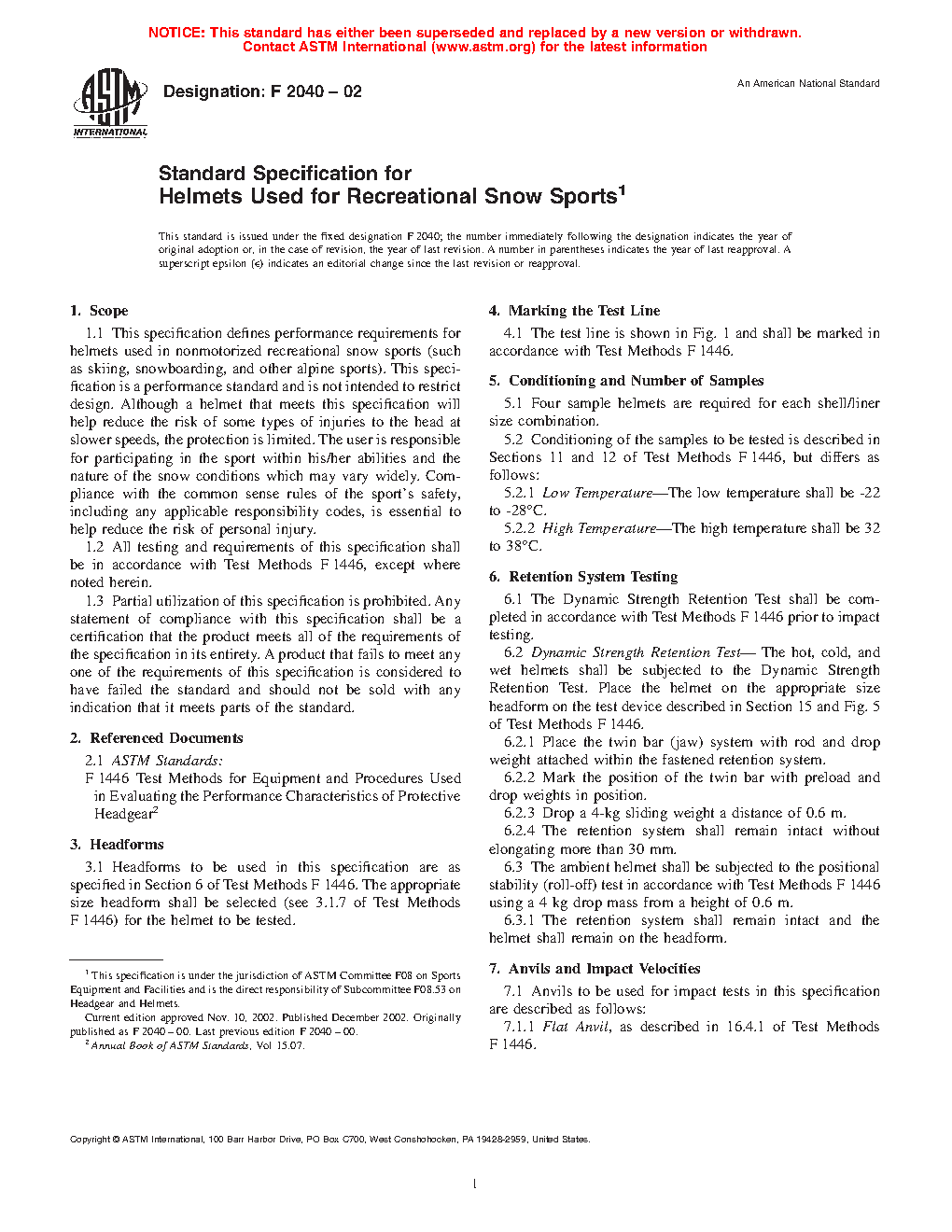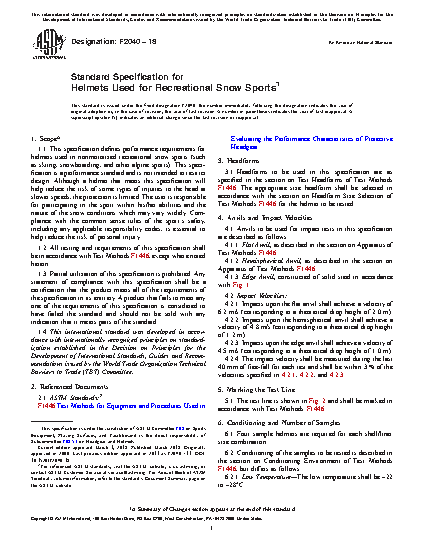 1.1 This specification defines performance requirements for helmets used in nonmotorized recreational snow sports (such as skiing, snowboarding, and other alpine sports). This specification is a performance standard and is not intended to restrict design. Although a helmet that meets this specification will help reduce the risk of some types of injuries to the head at slower speeds, the protection is limited. The user is responsible for participating in the sport within his/her abilities and the nature of the snow conditions which may vary widely. Compliance with the common sense rules of the sport's safety, including any applicable responsibility codes, is essential to help reduce the risk of personal injury.