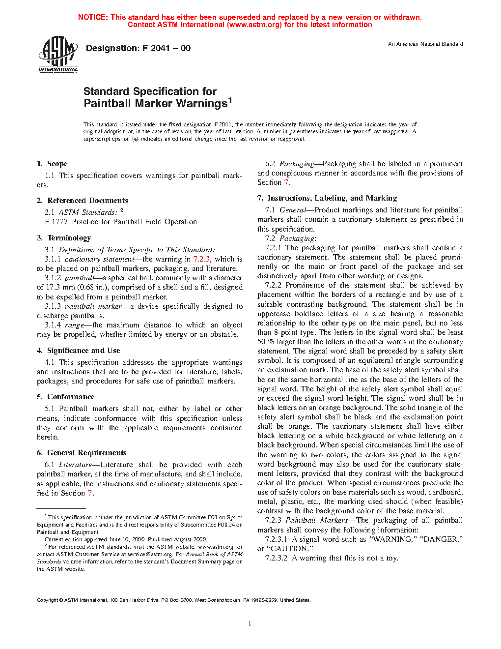 This specification covers warnings for paintball markers. The conformance, general requirements, packaging, instructions, labeling and marking are also detailed.