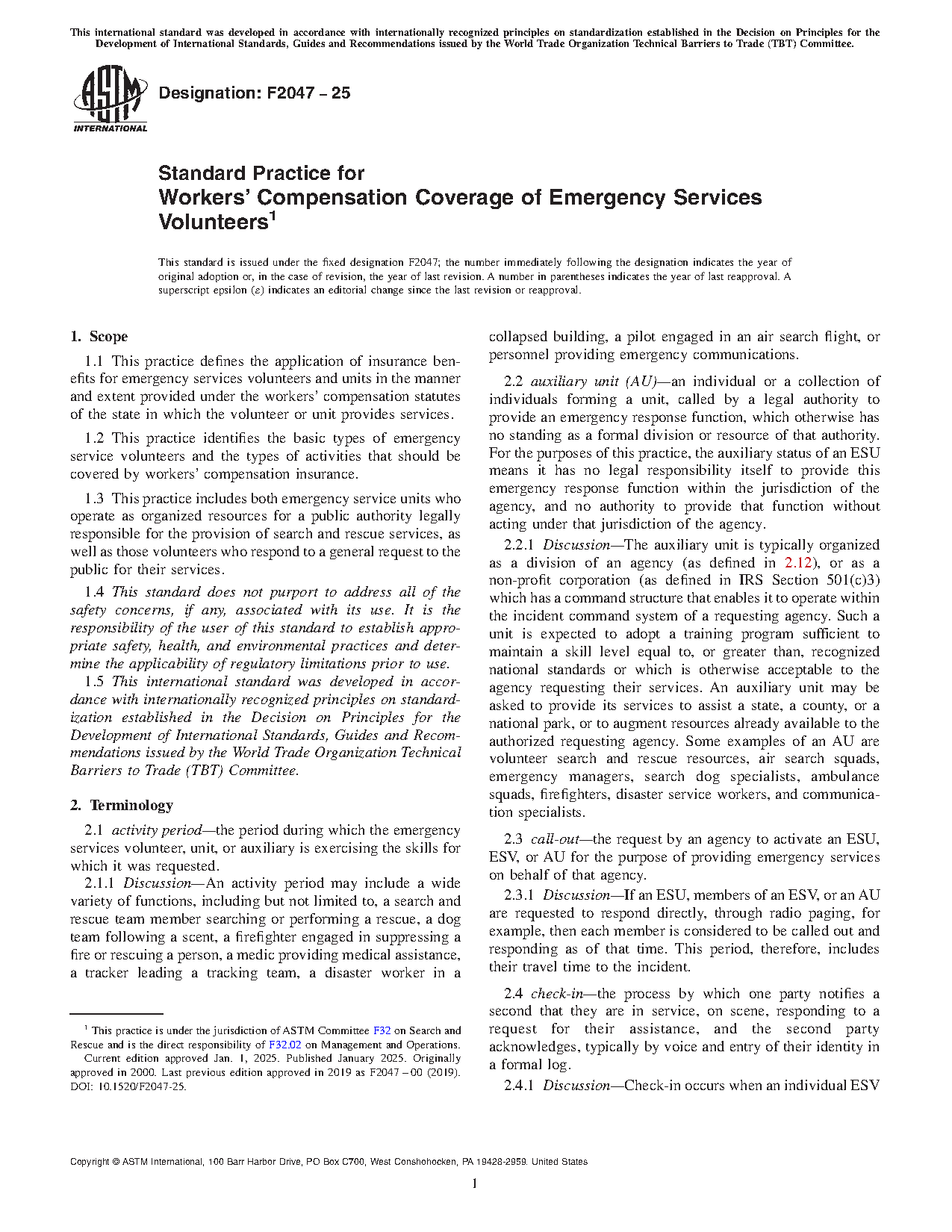 Standard Practice for Workers' Compensation Coverage of Emergency Services Volunteers