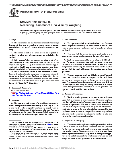 This test method establishes the apparatus required, specimen preparation steps, and standard procedures and calculations involved in the measurement of the average diameter of fine wires by means of weighing a known length. This applies particularly to wires of specified sizes used in electron devices and lamps.