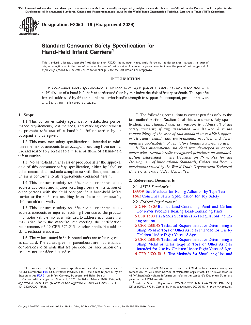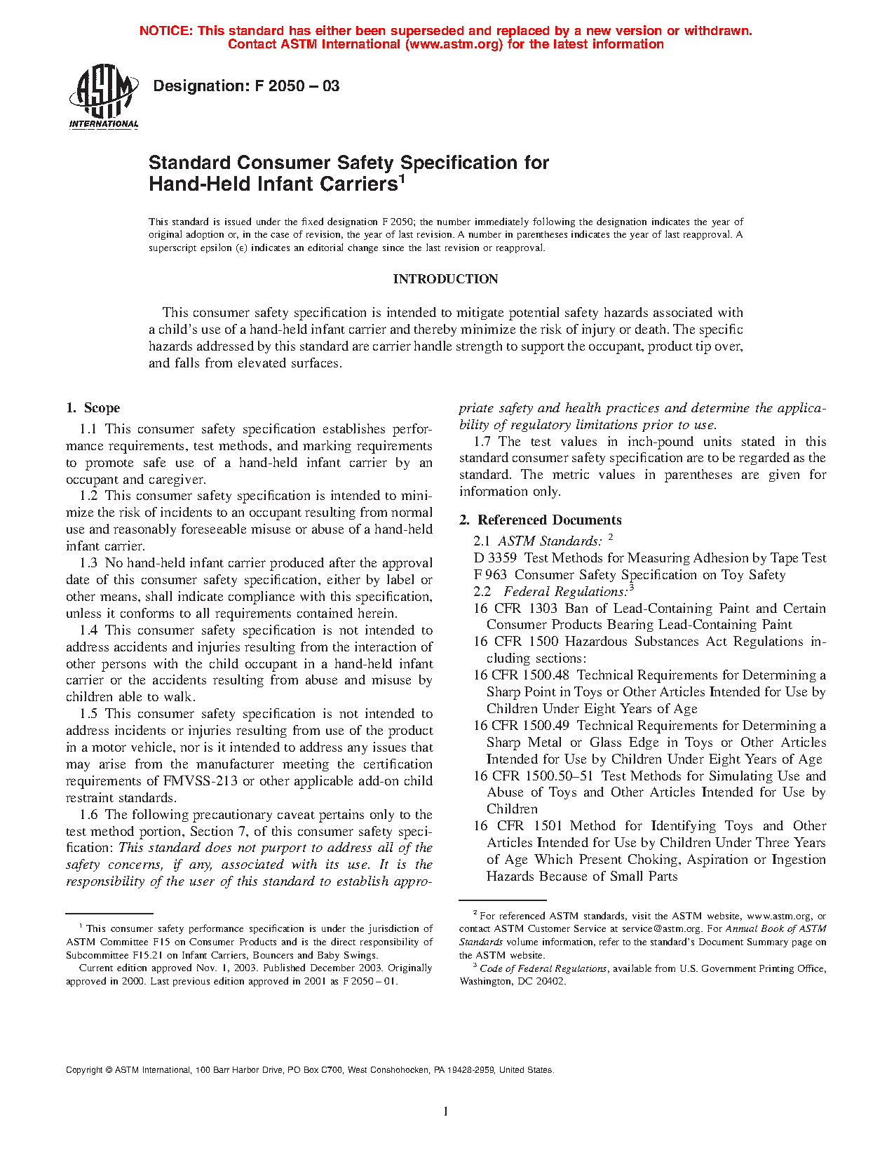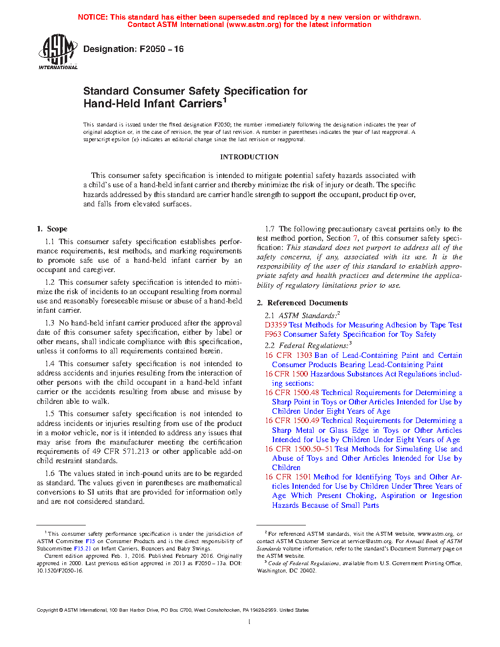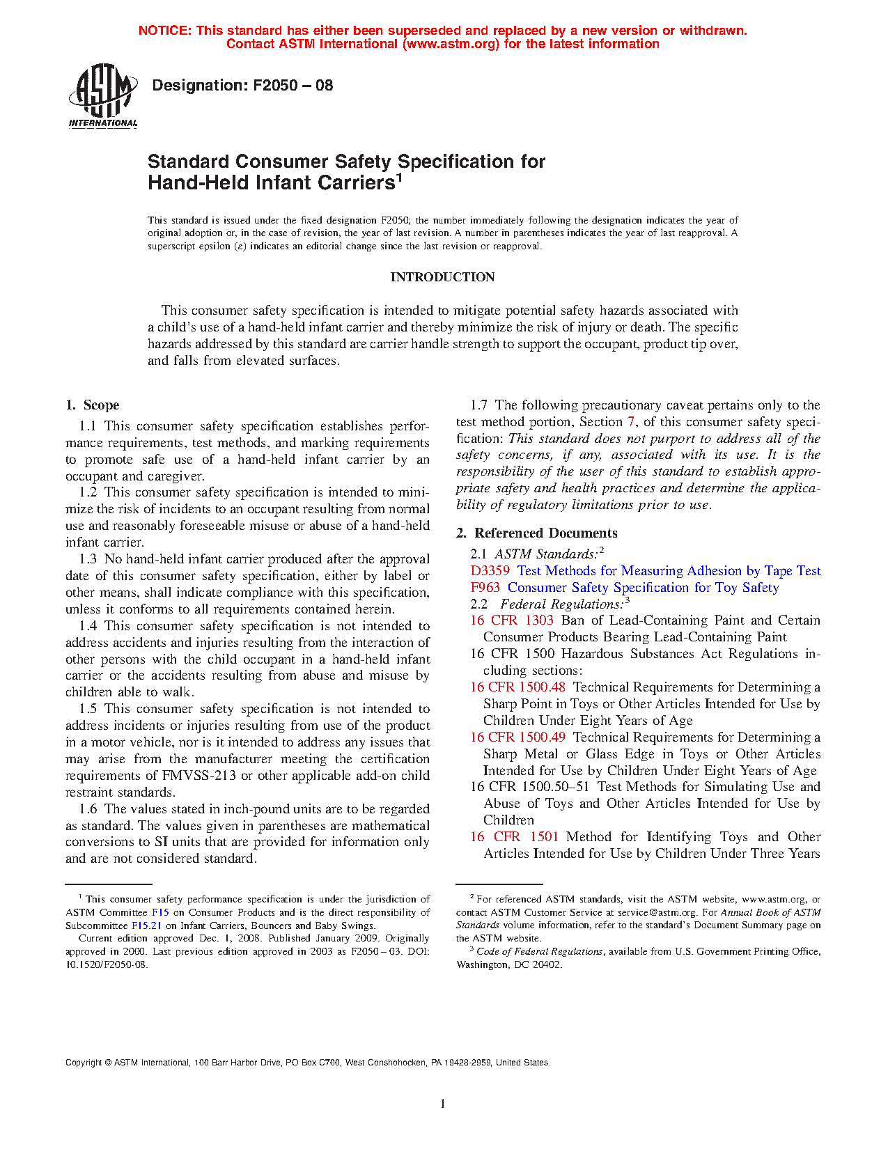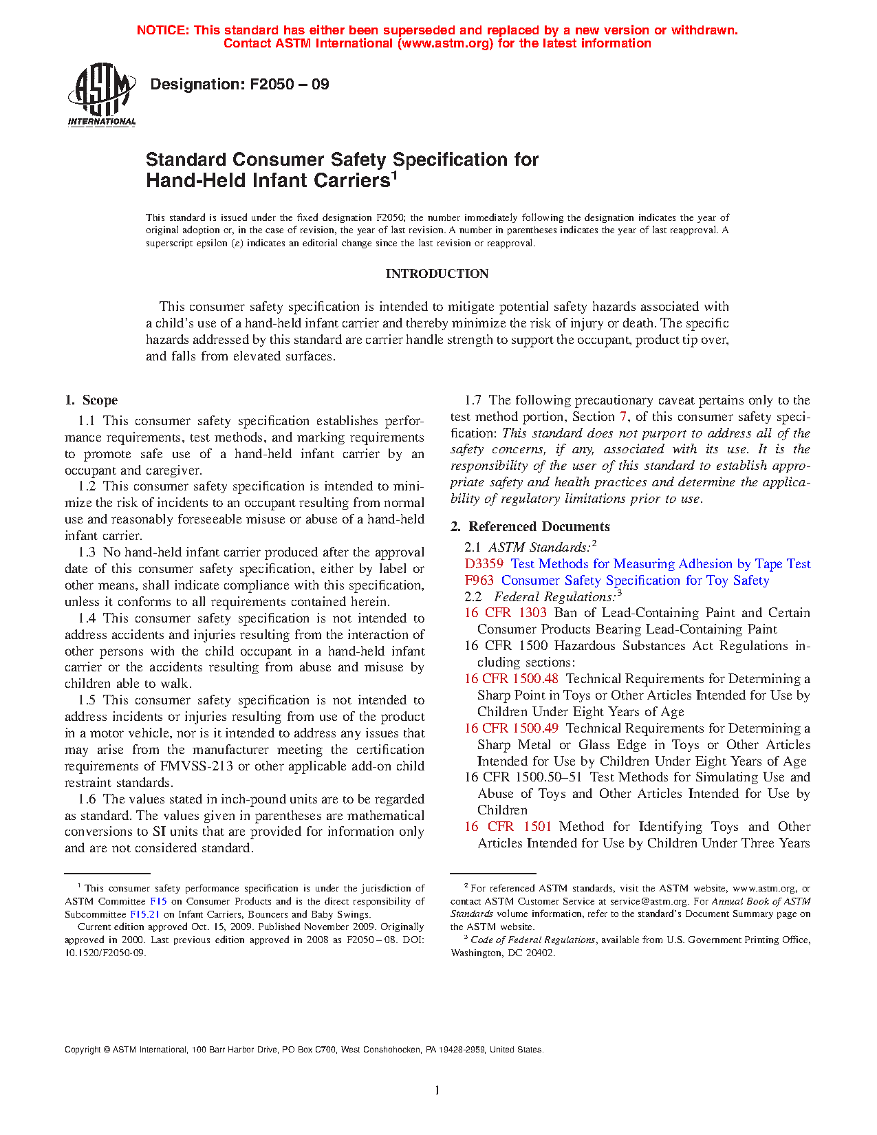 1.1 This consumer safety specification establishes performance requirements, test methods, and marking requirements to promote safe use of a hand-held infant carrier by an occupant and caregiver.