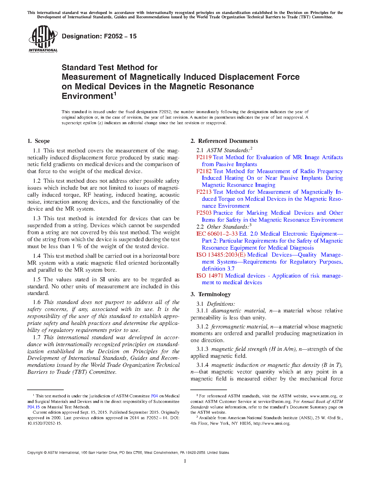 5.1 This test method is one of those required to determine if the presence of a medical device may cause injury to individuals during an MR examination and in the MR environment. Other safety issues which should be addressed include but may not be limited to magnetically induced torque (see Test Method F2213) and RF heating (see Test Method F2182). The terms and icons in Practice F2503 should be used to mark the device for safety in the magnetic resonance environment.