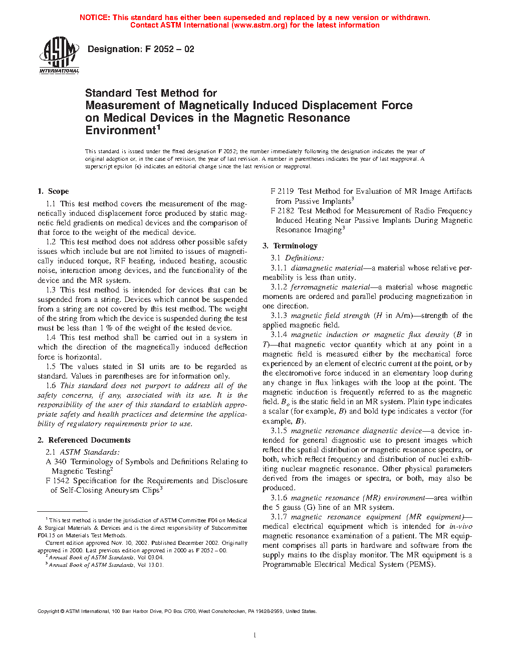 5.1 This test method is one of those required to determine if the presence of a medical device may cause injury to individuals during an MR examination and in the MR environment. Other safety issues which should be addressed include but may not be limited to magnetically induced torque (see Test Method F2213) and RF heating (see Test Method F2182). The terms and icons in Practice F2503 should be used to mark the device for safety in the magnetic resonance environment.