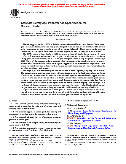 1.1 This standard specifies safety and performance requirements aimed at providing for safer use of soccer goals and reducing injuries and fatalities.
