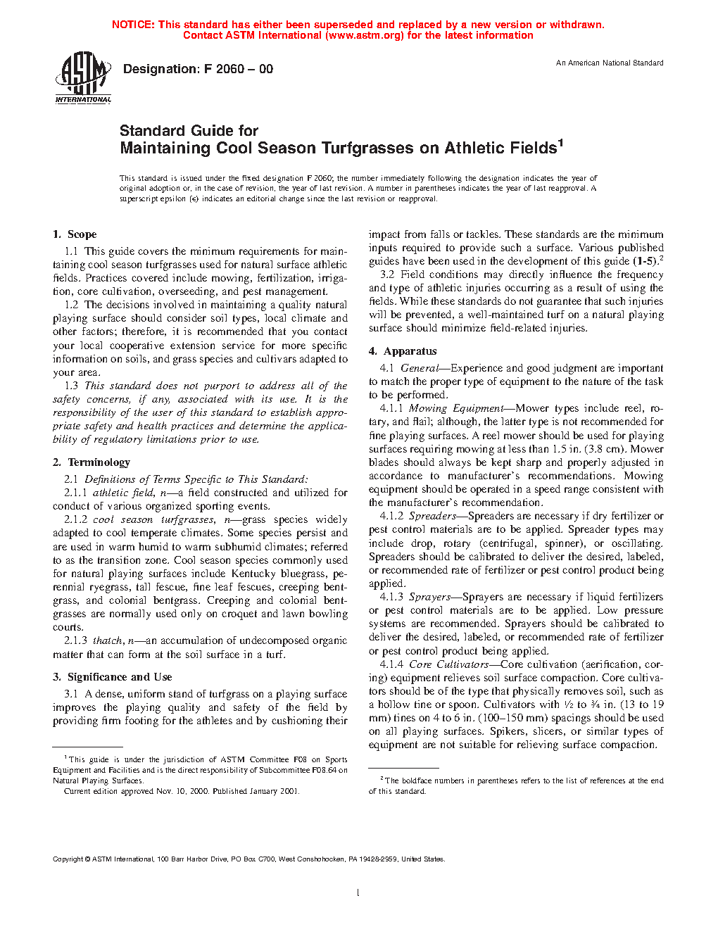 1.1 This guide covers the minimum requirements for maintaining cool season turfgrasses used for natural surface athletic fields. Practices covered include mowing, fertilization, irrigation, core cultivation, overseeding, and pest management.