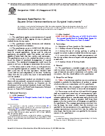 This specification covers the dimensions and tolerances for both driving and driven elements in square drive interconnections on stainless steel surgical instruments used for drilling, tapping, driving, or placing of medical devices during surgery. The specification is intended to lessen the chance of accidental disengagement of surgical instruments.