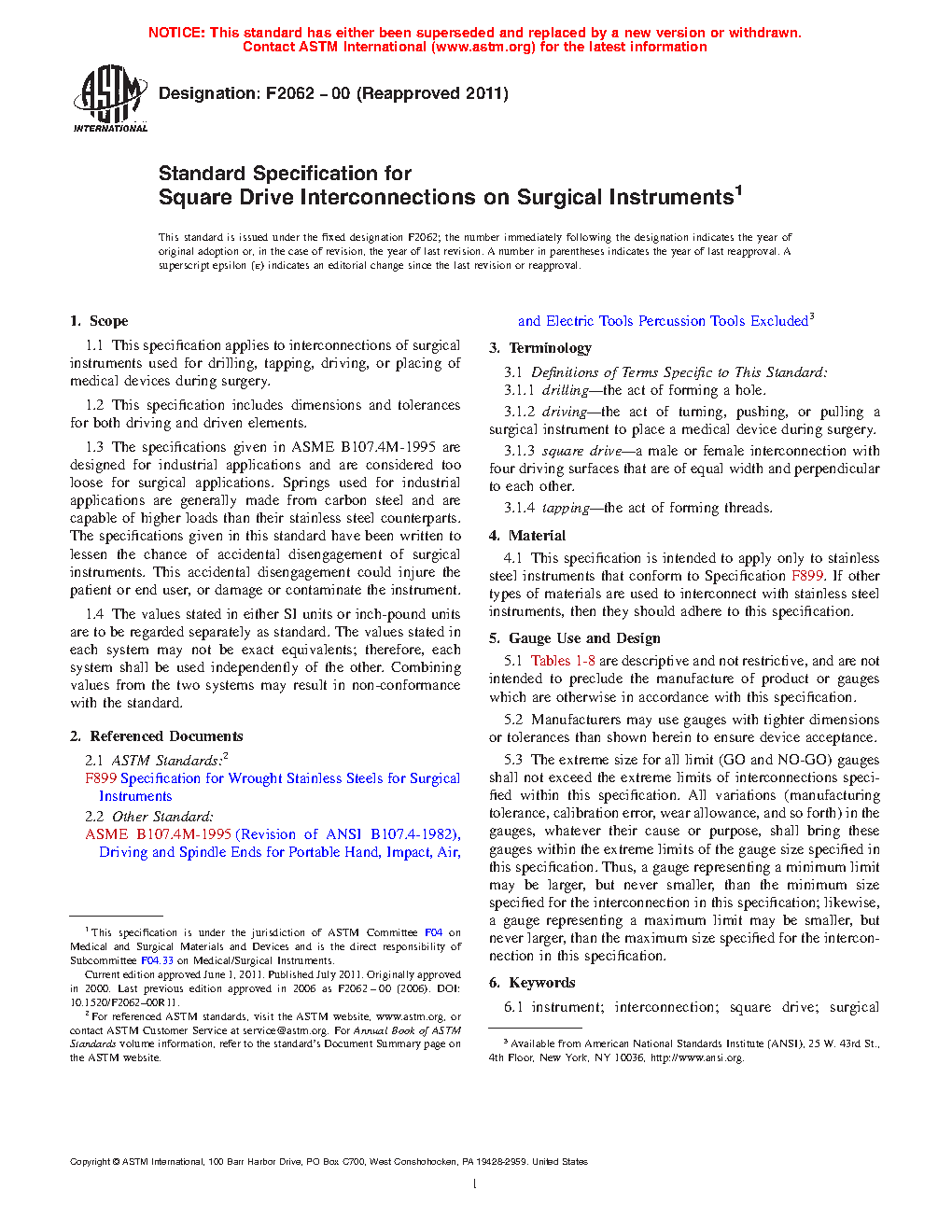 1.1 This specification applies to interconnections of surgical instruments used for drilling, tapping, driving, or placing of medical devices during surgery.