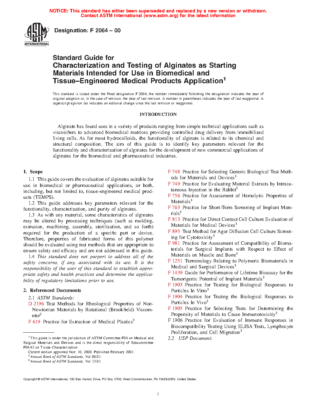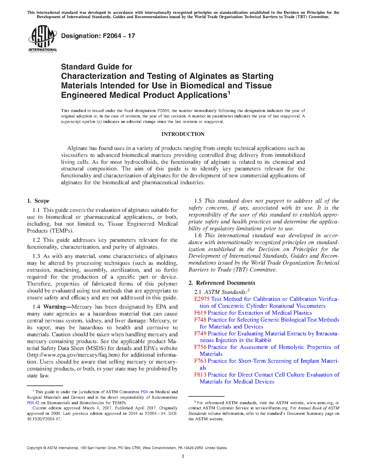 4.2 The alginate covered by this guide may be gelled, extruded, or otherwise formulated into biomedical devices for use in tissue-engineered medical products or drug delivery devices for implantation as determined to be appropriate, based on supporting biocompatibility and physical test data. Recommendations in this guide should not be interpreted as a guarantee of clinical success in any tissue engineered medical product or drug delivery application. Further guidance for immobilizing or encapsulating living cells or tissue in alginate gels can be found in Guide F2315.