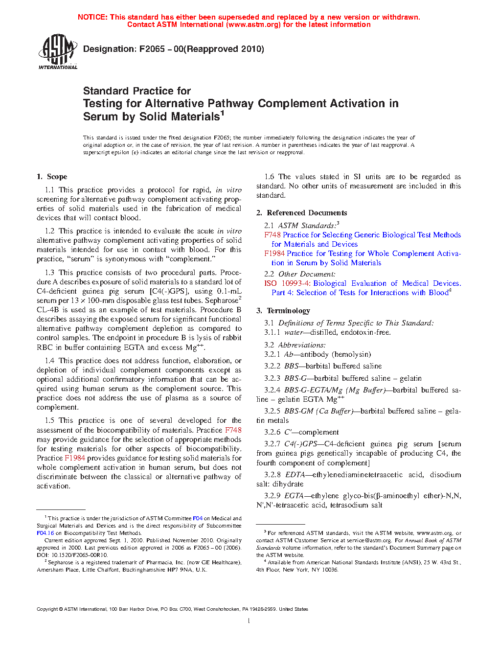 1.5 This practice is one of several developed for the assessment of the biocompatibility of materials. Practice F748 may provide guidance for the selection of appropriate methods for testing materials for other aspects of biocompatibility. Practice F1984 provides guidance for testing solid materials for whole complement activation in human serum, but does not discriminate between the classical or alternative pathway of activation.