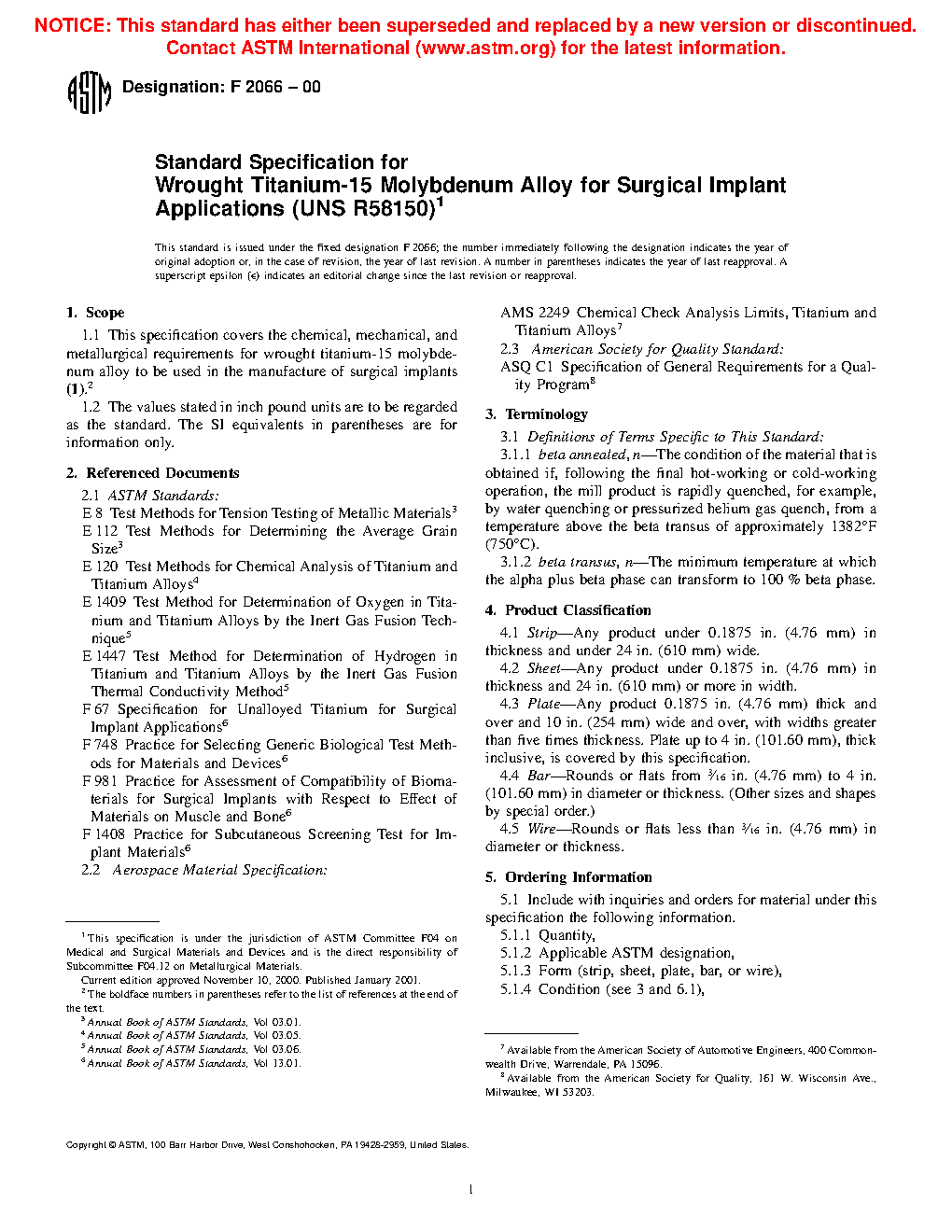 1.1 This specification covers the chemical, mechanical, and metallurgical requirements for wrought titanium-15 molybdenum alloy to be used in the manufacture of surgical implants (1).2