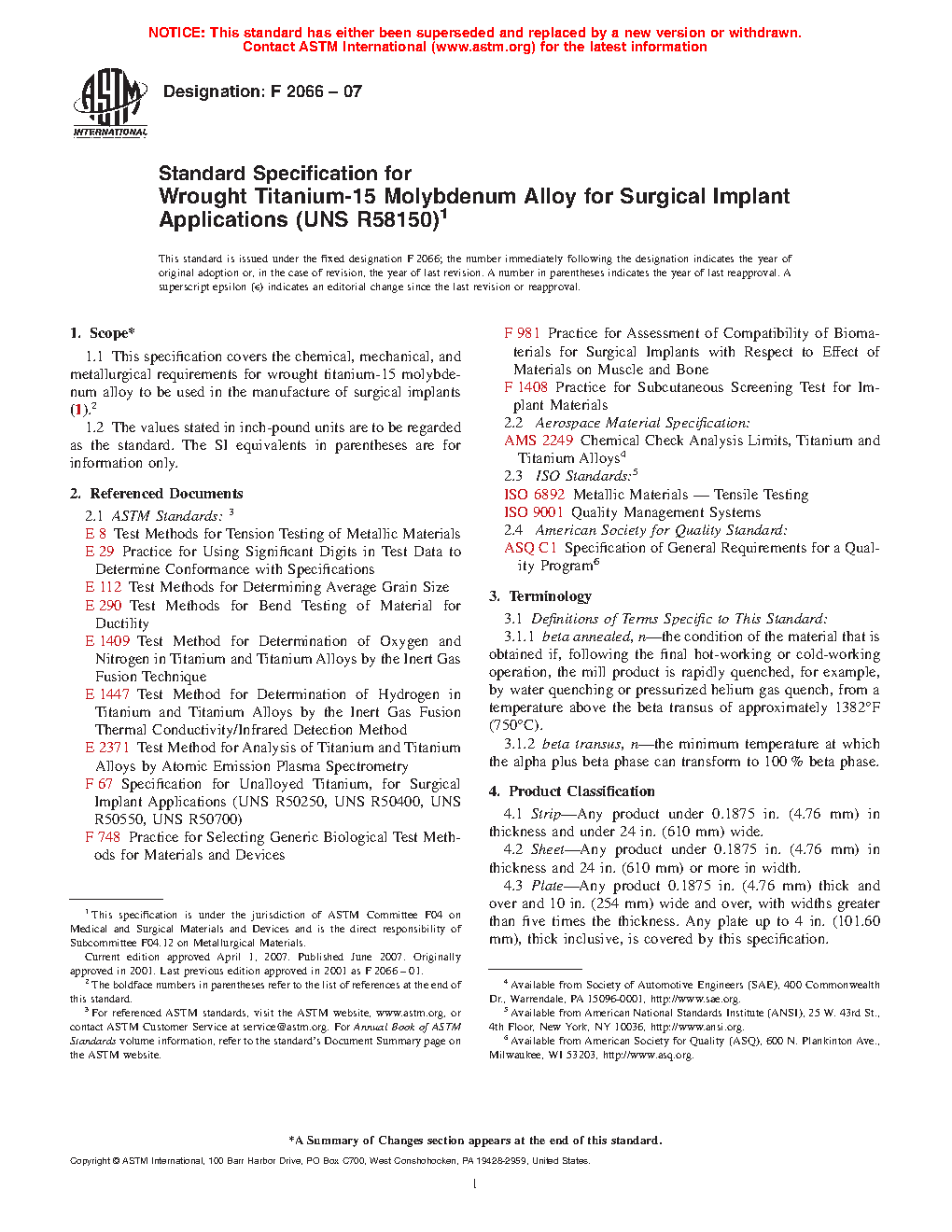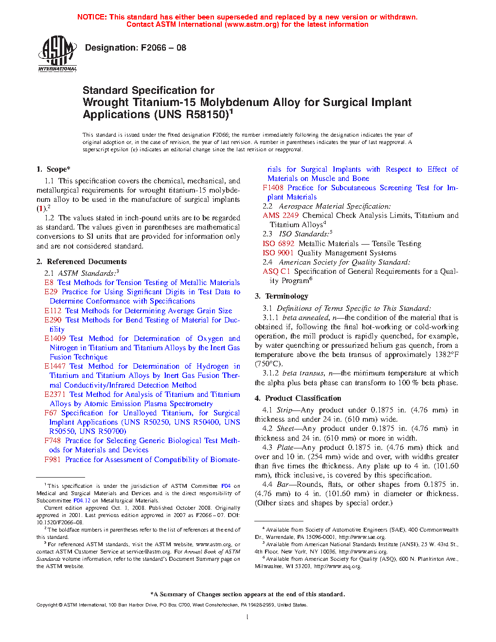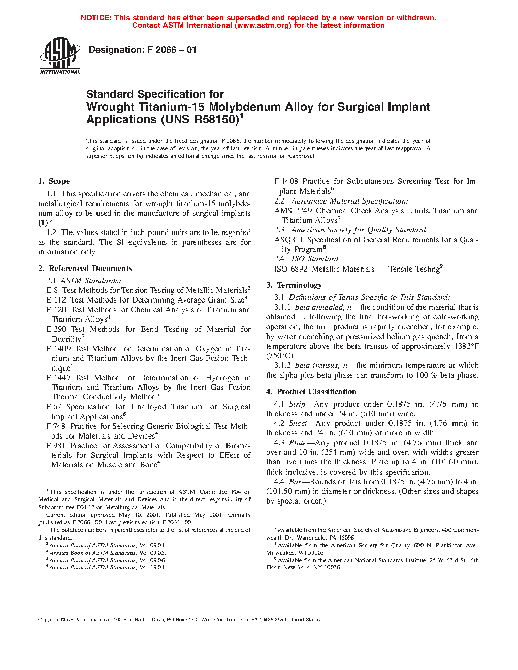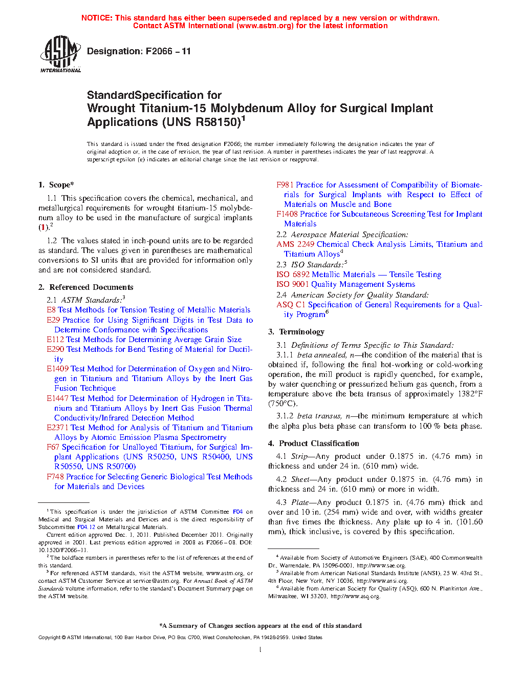 Standard Specification for Wrought Titanium-15 Molybdenum Alloy for Surgical Implant Applications (UNS R58150)