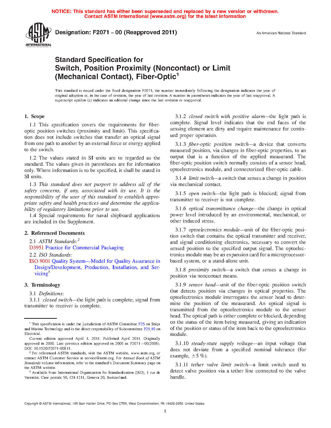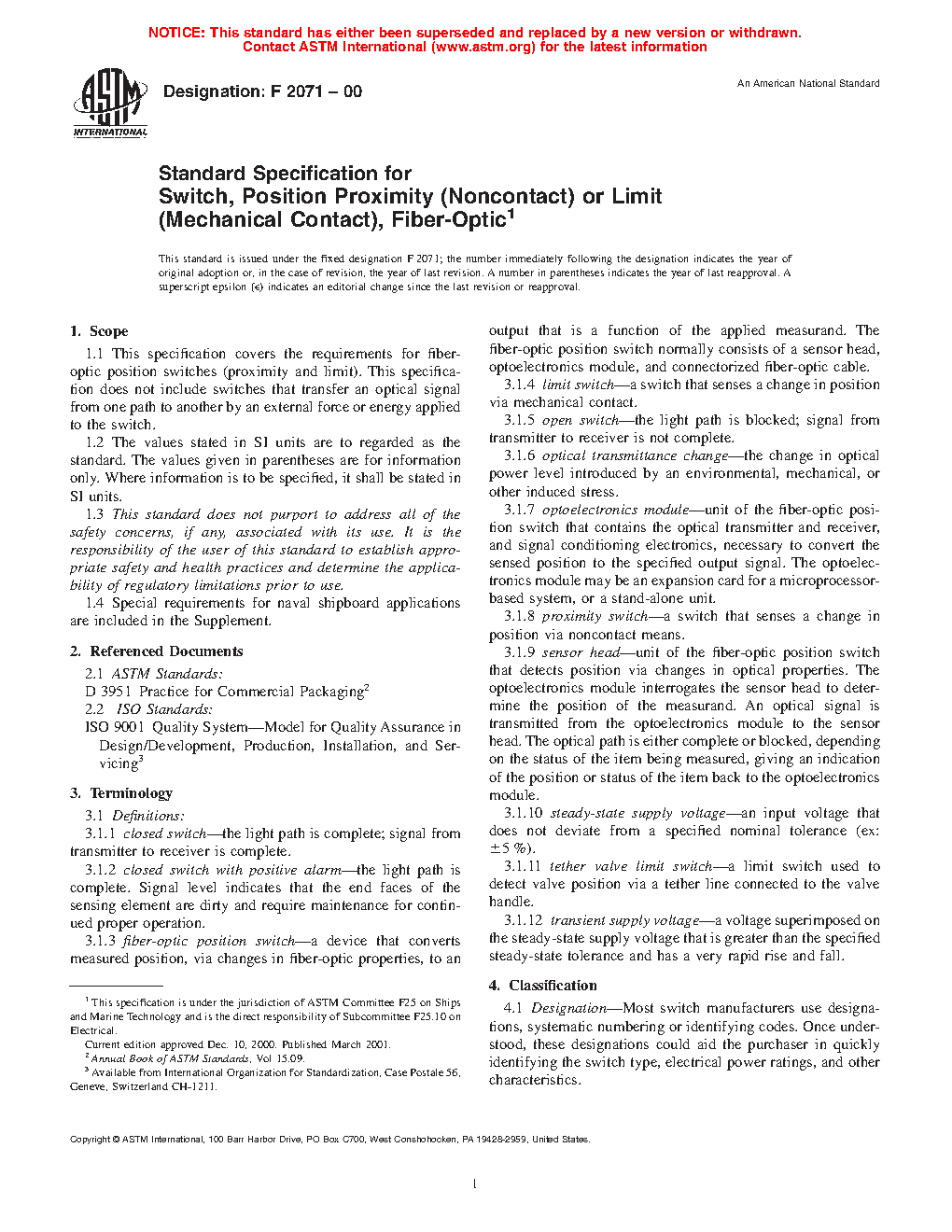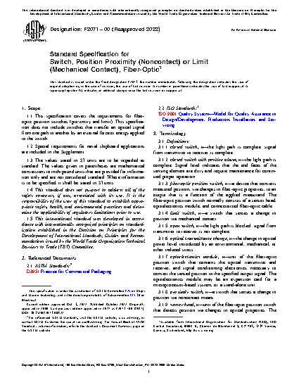 This specification covers the requirements for the proximity and limit of fiber-optic position switches. This specification does not include switches that transfer an optical signal from one path to another by an external force or energy applied to the switch. The fiber-optic switches meet physical property requirements stipulated for enclosure, optoelectronic module, external configuration, and size and weight. The switches shall also adhere to minimum specified service life requiements. Other critical performance requirements shall be specified in the acquisition order as deemed important to the purchaser.