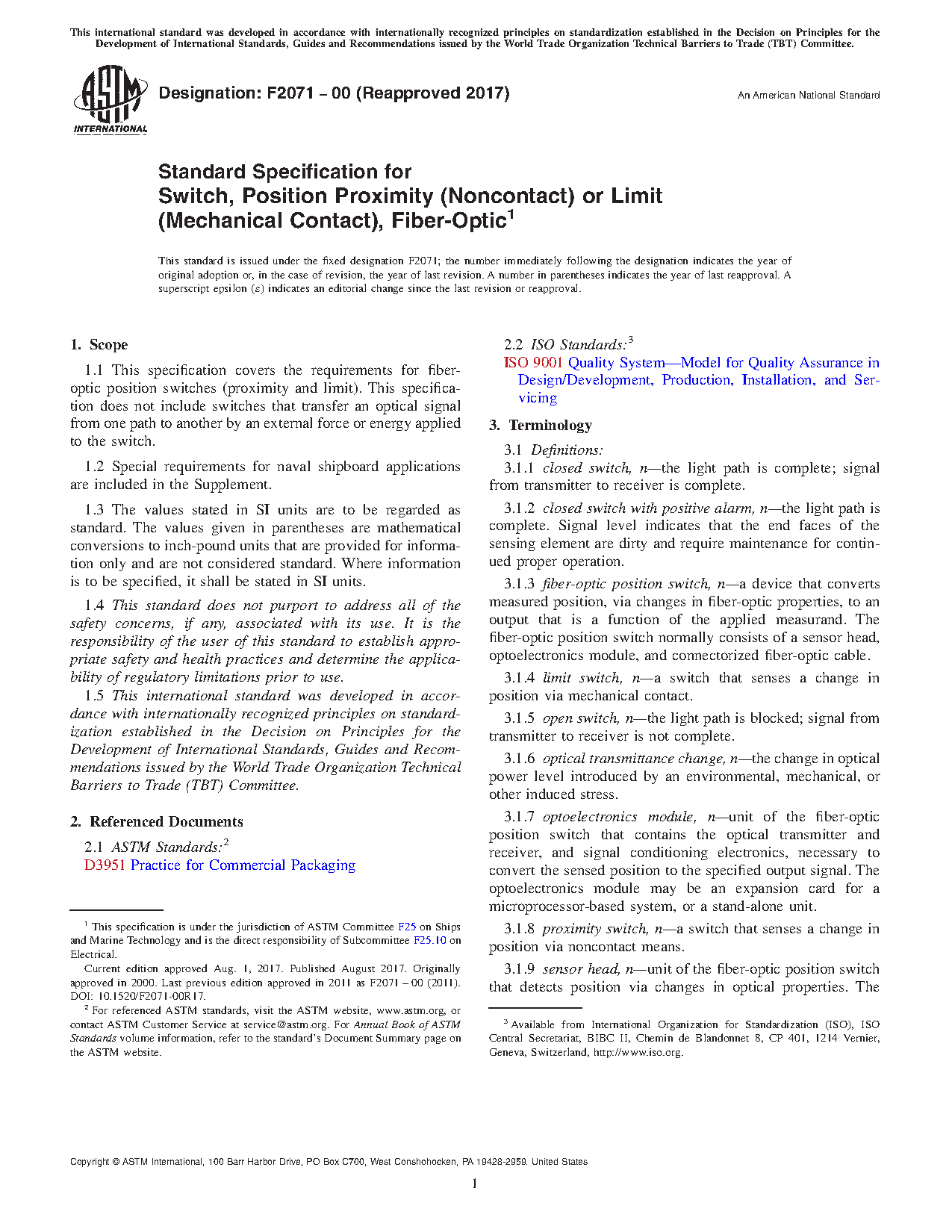 1.1 This specification covers the requirements for fiber-optic position switches (proximity and limit). This specification does not include switches that transfer an optical signal from one path to another by an external force or energy applied to the switch.
