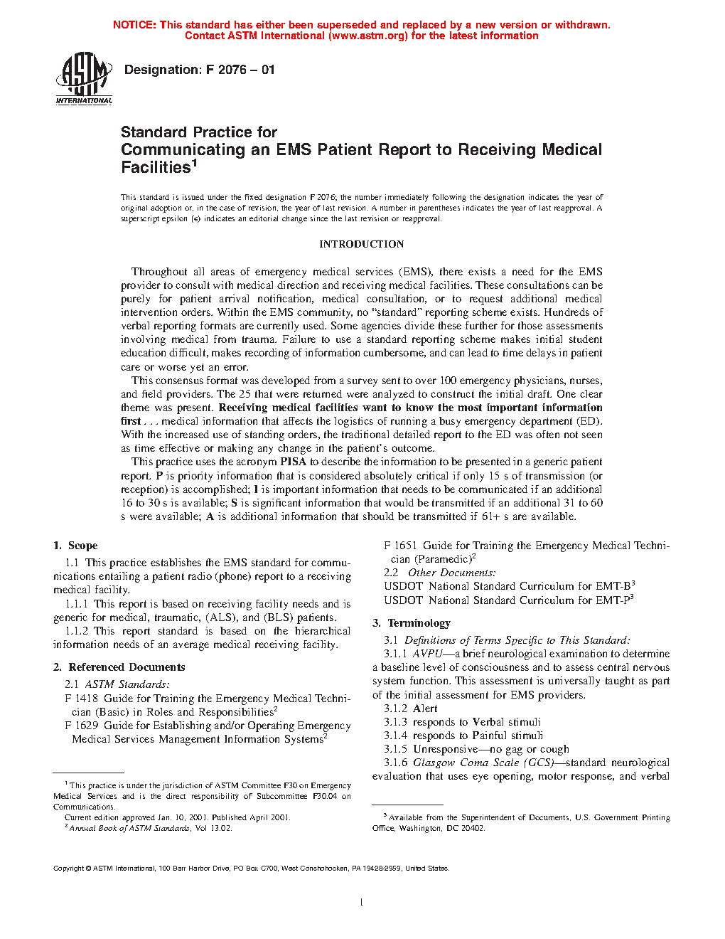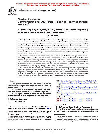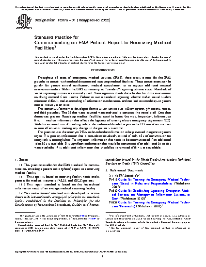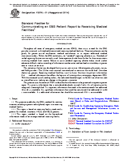 1.1 This practice establishes the EMS standard for communications entailing a patient radio (phone) report to a receiving medical facility.