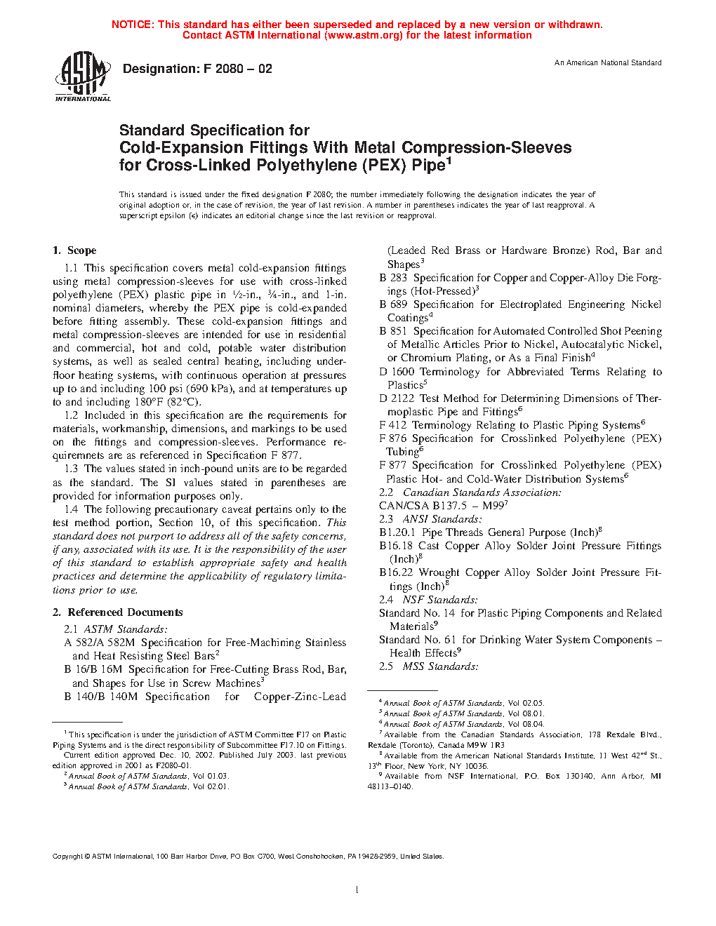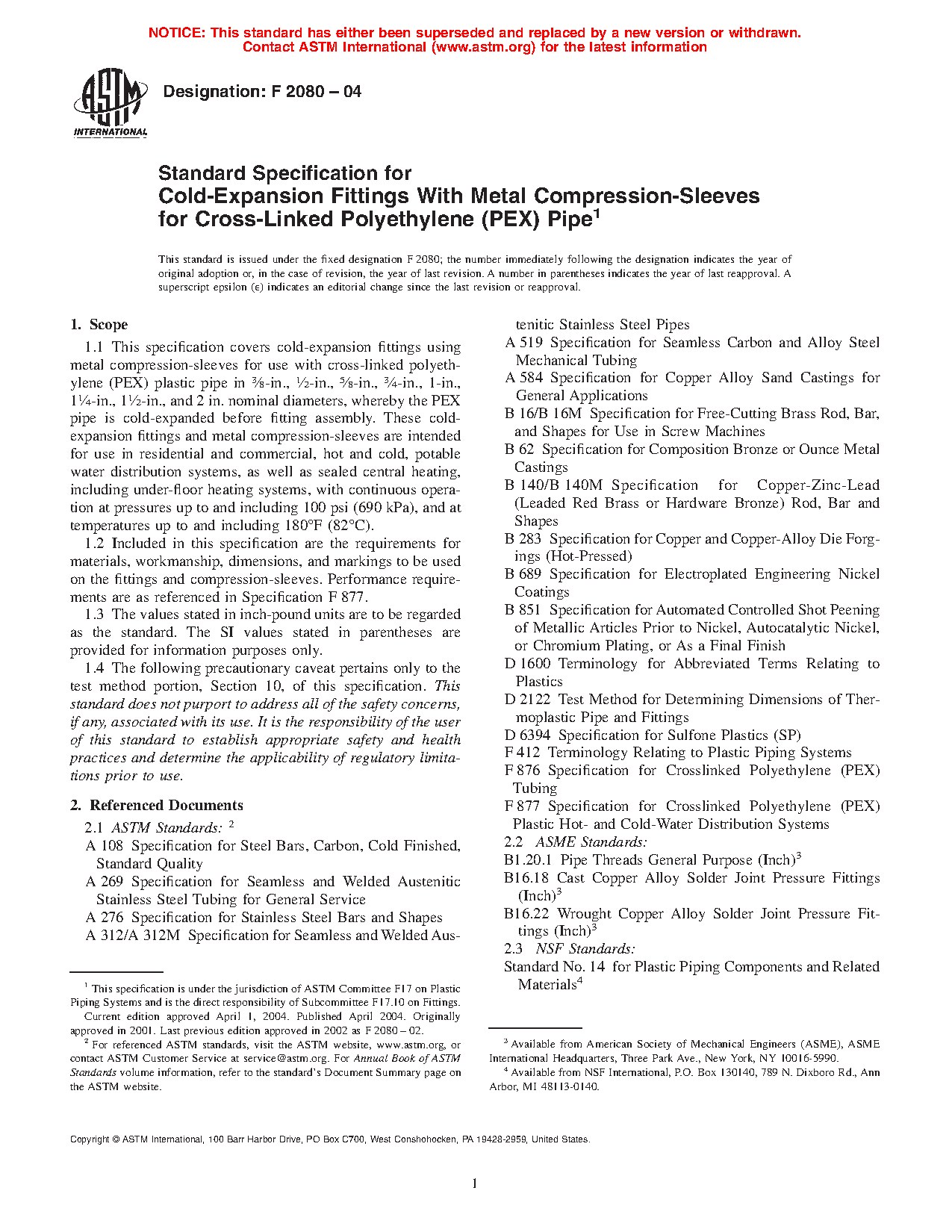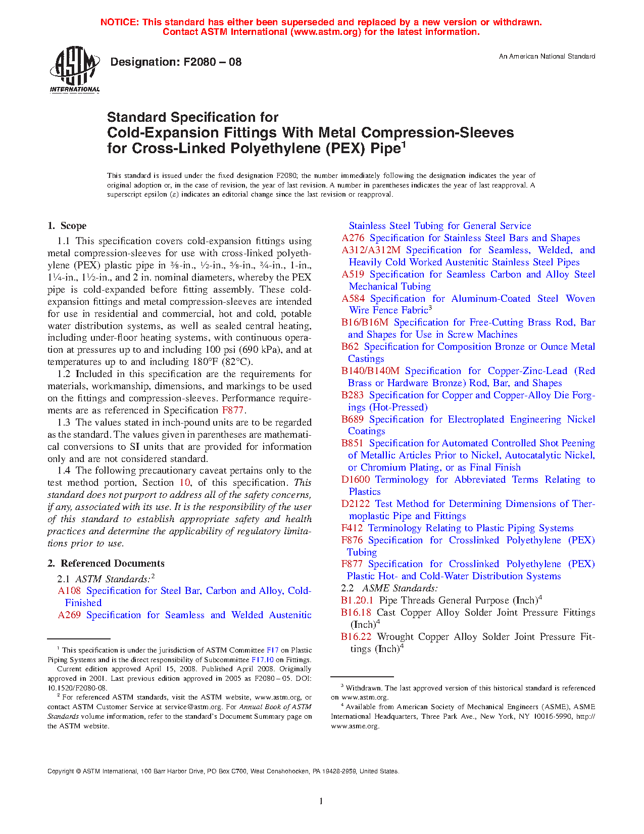 1.1 This specification covers cold-expansion fittings using metal compression-sleeves for use with cross-linked polyethylene (PEX) plastic pipe in 3/8-in., 1/2-in., 5/8-in., 3/4-in., 1-in., 11/4-in., 11/2-in., and 2 in. nominal diameters, whereby the PEX pipe is cold-expanded before fitting assembly. These cold-expansion fittings and metal compression-sleeves are intended for use in residential and commercial, hot and cold, potable water distribution systems, as well as sealed central heating, including under-floor heating systems, with continuous operation at pressures up to and including 100 psi (690 kPa), and at temperatures up to and including 180F (82C).