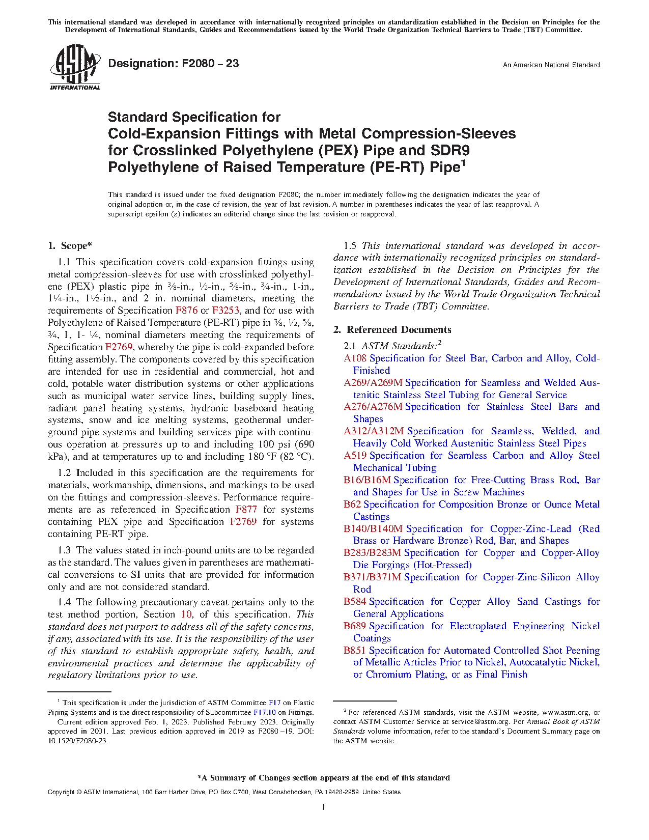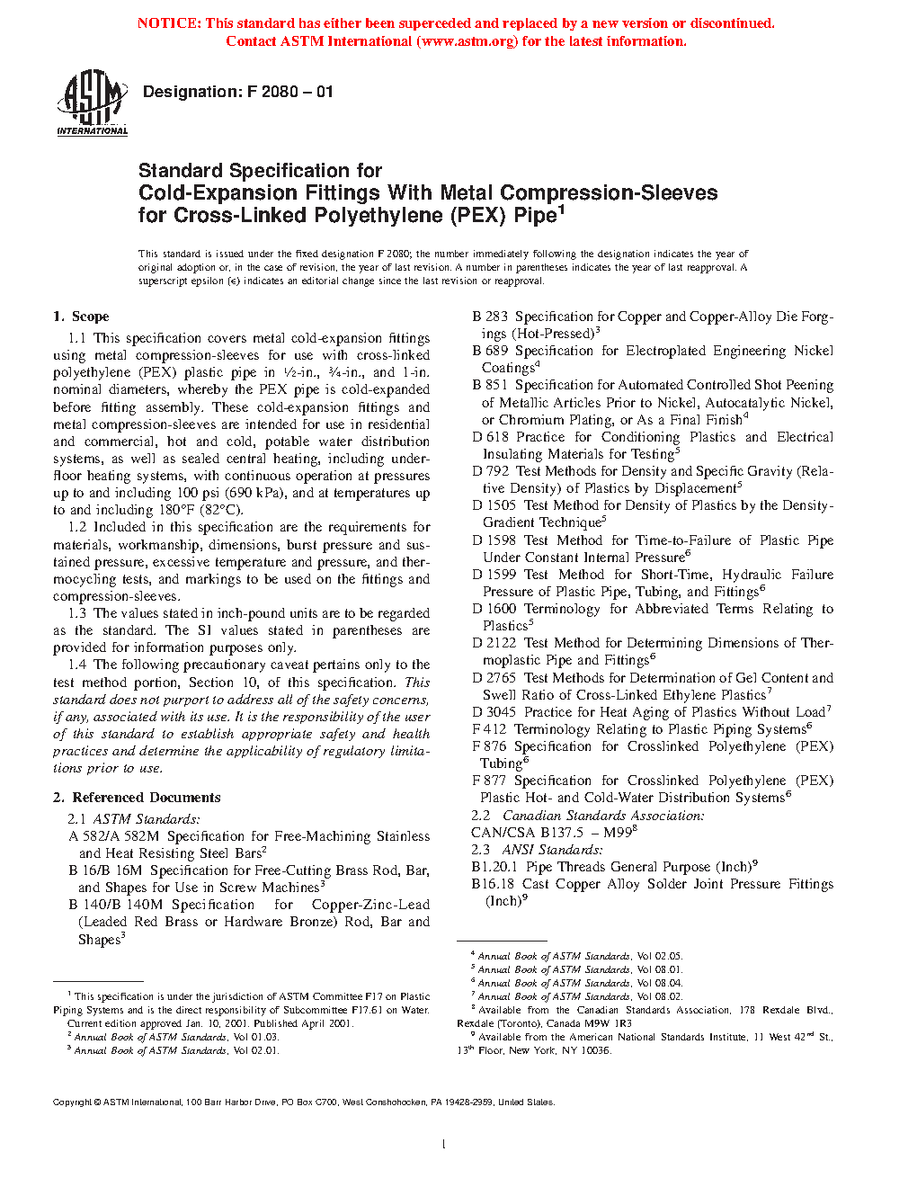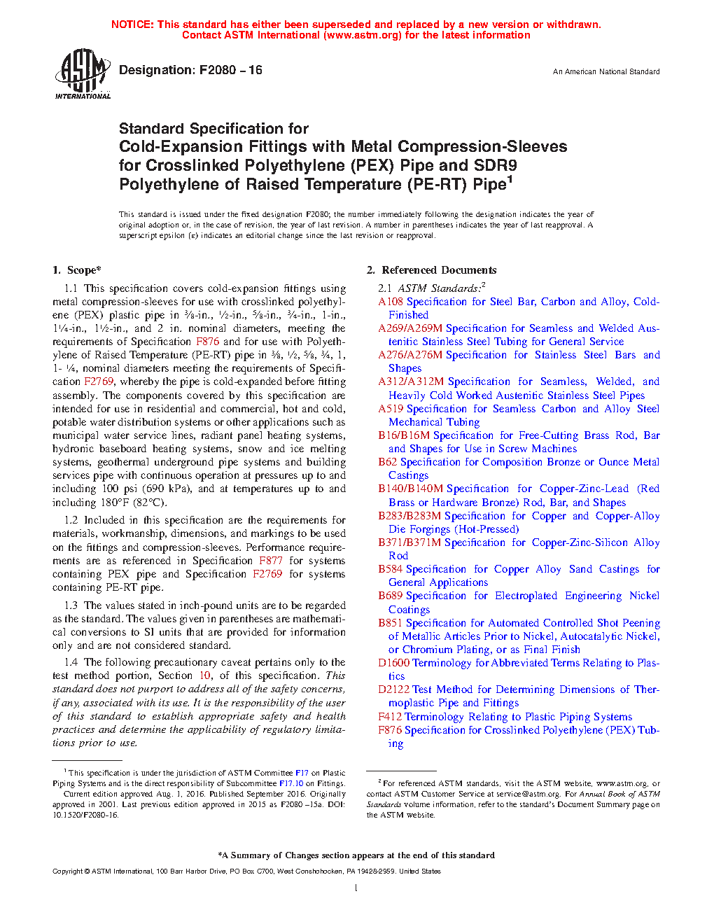 1.1 This specification covers cold-expansion fittings using metal compression-sleeves for use with cross-linked polyethylene (PEX) plastic pipe in 3/8-in., 1/2-in., 5/8-in., 3/4-in., 1-in., 11/4-in., 11/2-in., and 2 in. nominal diameters, whereby the PEX pipe is cold-expanded before fitting assembly. These cold-expansion fittings and metal compression-sleeves are intended for use in residential and commercial, hot and cold, potable water distribution systems, as well as sealed central heating, including under-floor heating systems, with continuous operation at pressures up to and including 100 psi (690 kPa), and at temperatures up to and including 180F (82C).