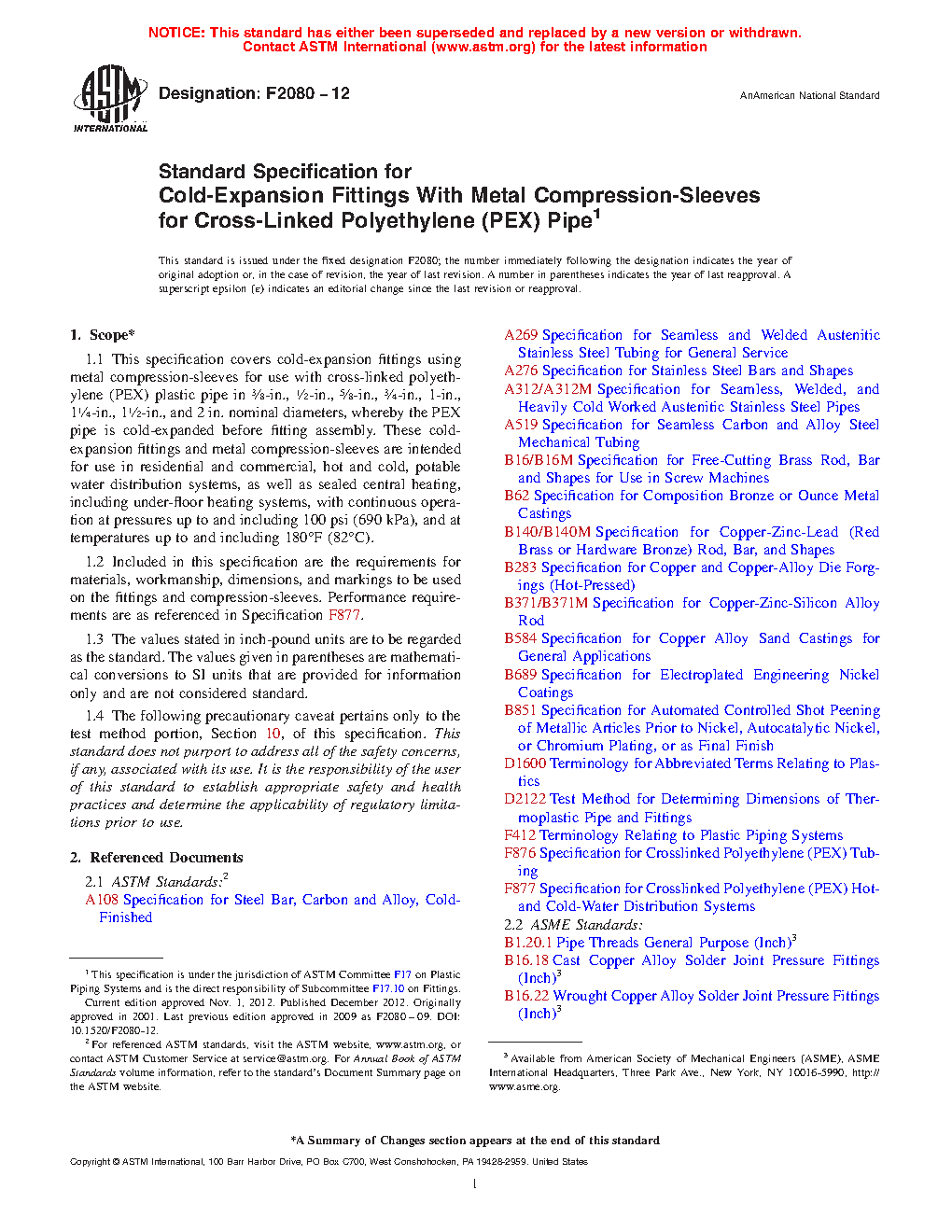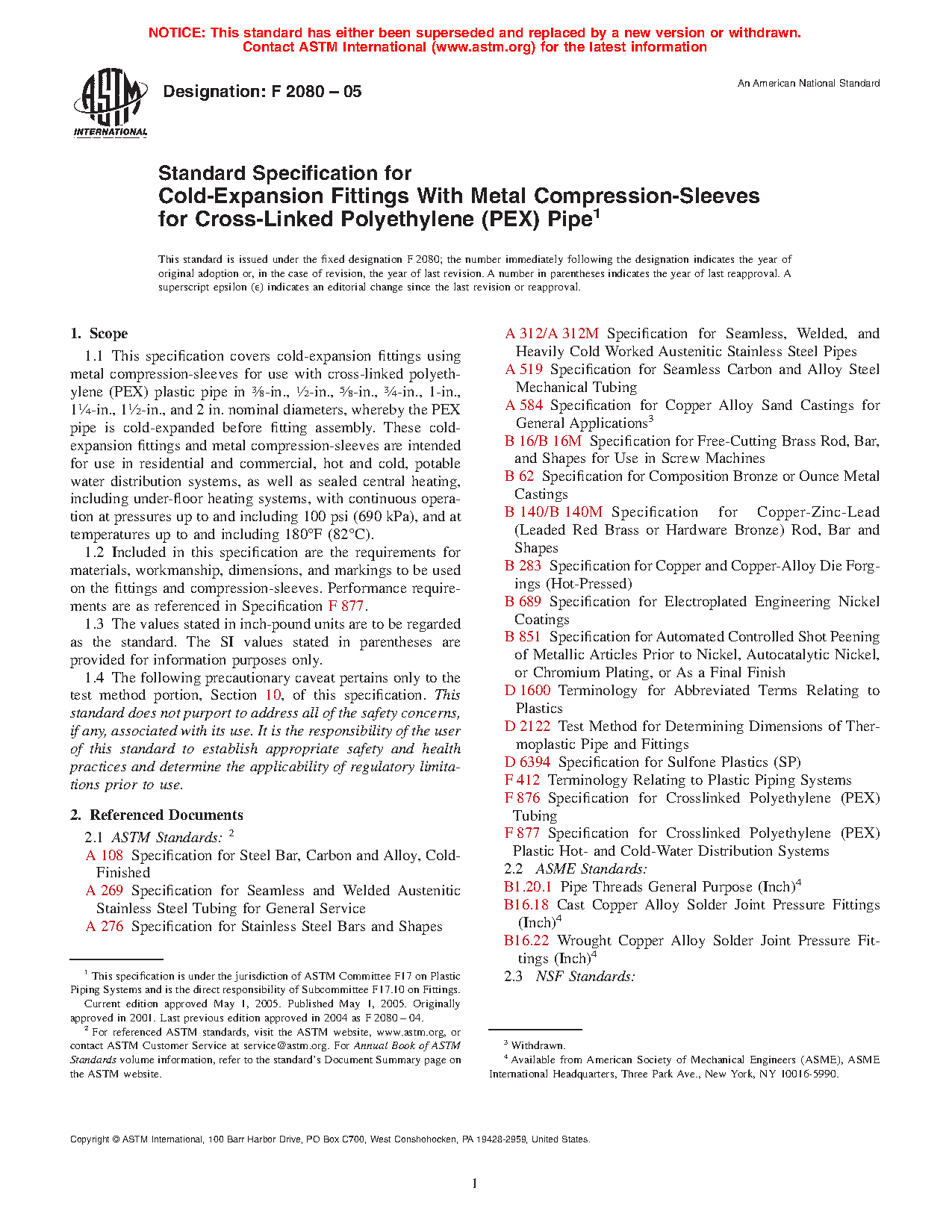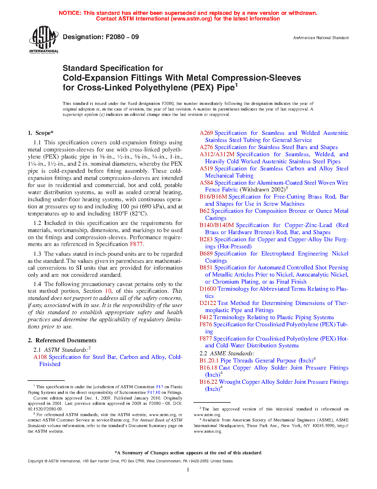 1.1 This specification covers cold-expansion fittings using metal compression-sleeves for use with cross-linked polyethylene (PEX) plastic pipe in 3/8-in., 1/2-in., 5/8-in., 3/4-in., 1-in., 11/4-in., 11/2-in., and 2 in. nominal diameters, whereby the PEX pipe is cold-expanded before fitting assembly. These cold-expansion fittings and metal compression-sleeves are intended for use in residential and commercial, hot and cold, potable water distribution systems, as well as sealed central heating, including under-floor heating systems, with continuous operation at pressures up to and including 100 psi (690 kPa), and at temperatures up to and including 180°F (82°C).