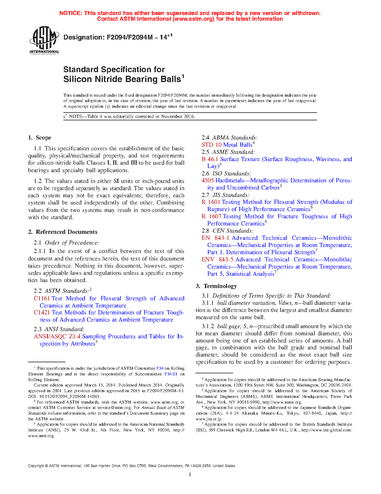 1.1 This specification covers the establishment of the basic quality, physical/mechanical property, and test requirements for silicon nitride balls Classes I, II, and III to be used for ball bearings and specialty ball applications.
