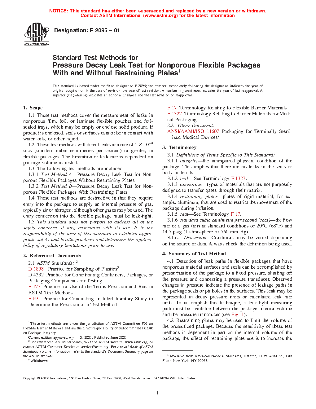 1.1 These test methods cover the measurement of leaks in nonporous film, foil, or laminate flexible pouches and foil-sealed trays, which may be empty or enclose solid product. If product is enclosed, seals or surfaces cannot be in contact with water, oils, or other liquid.