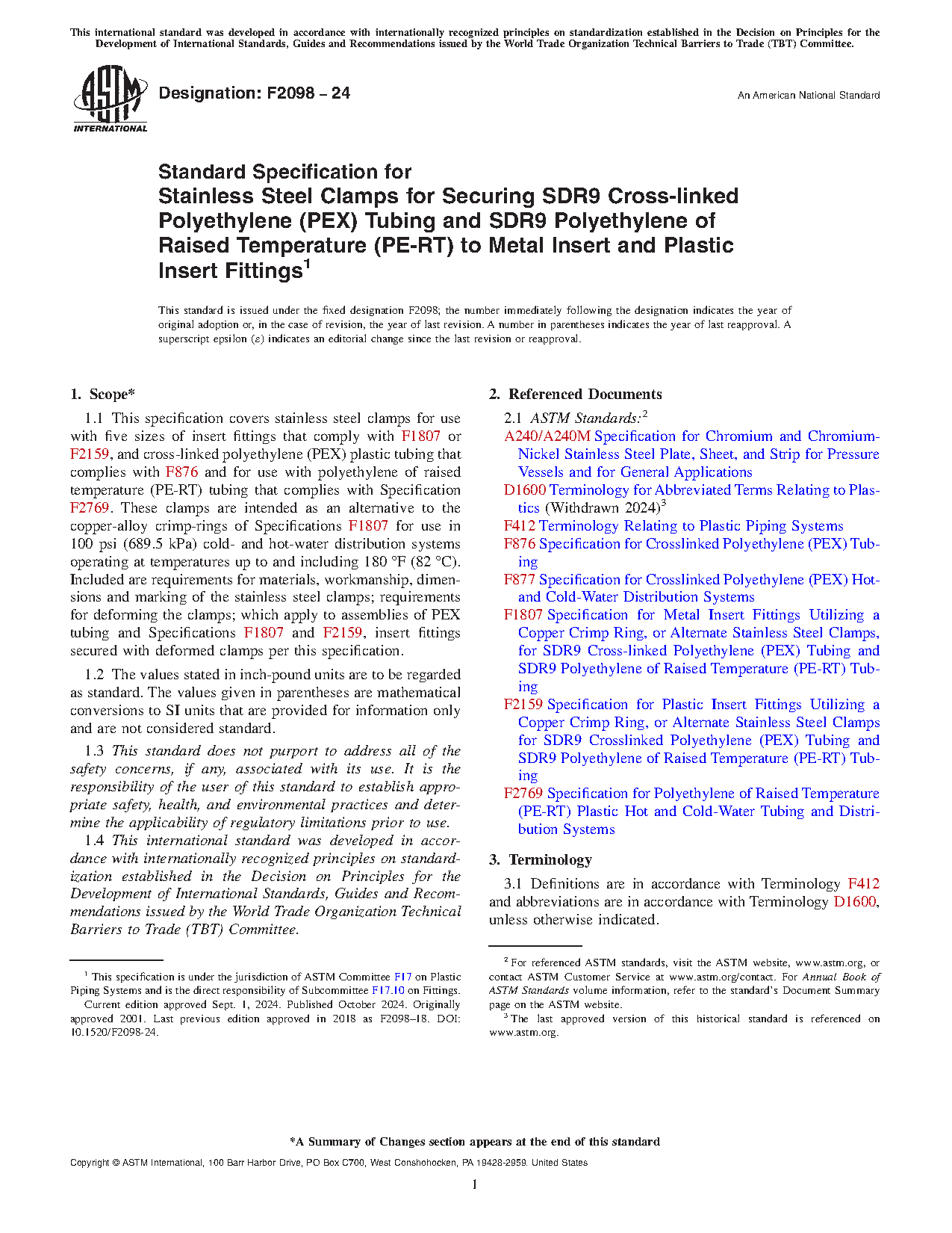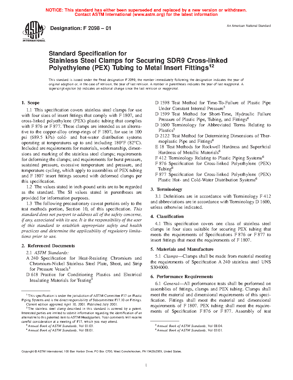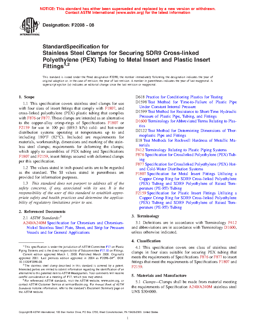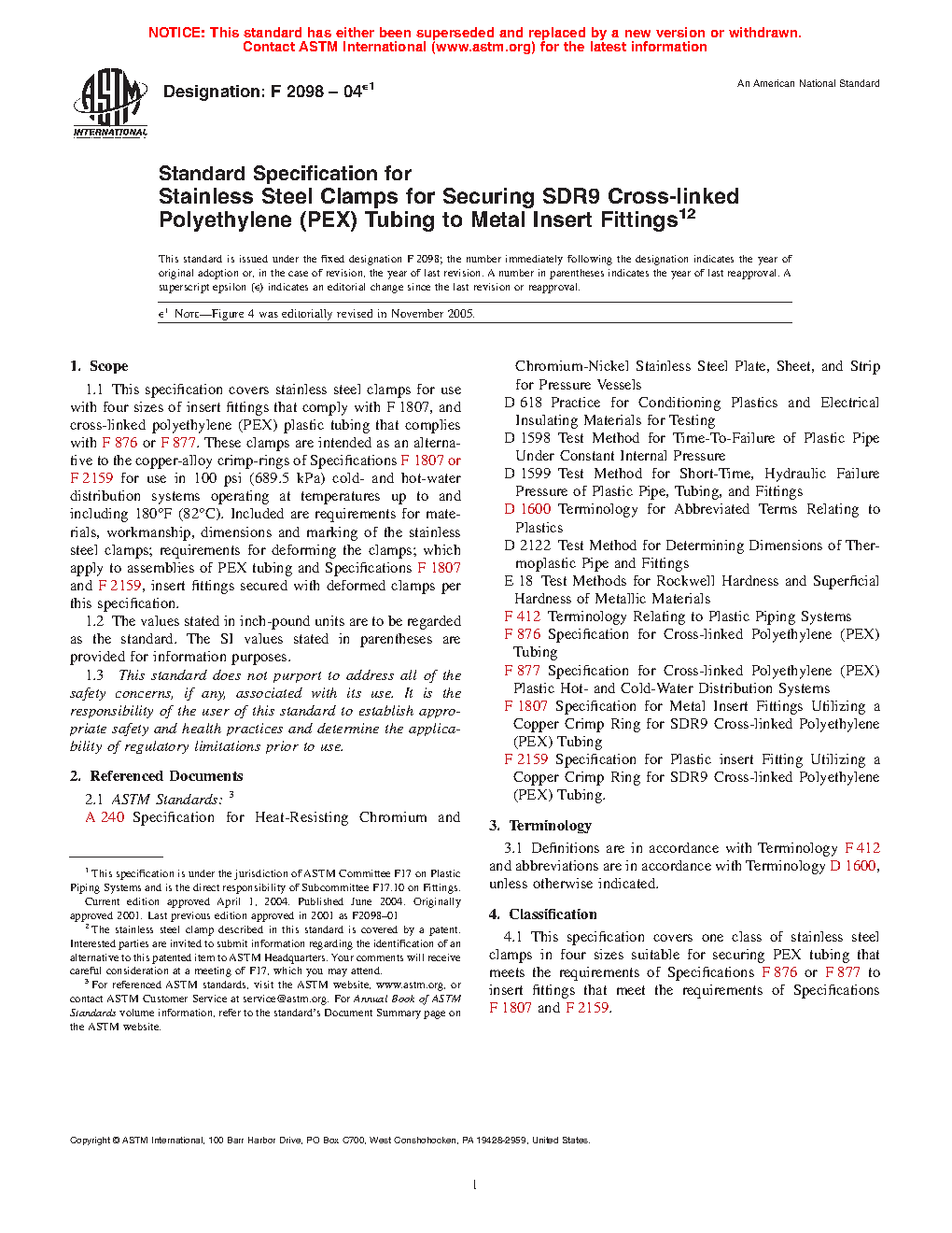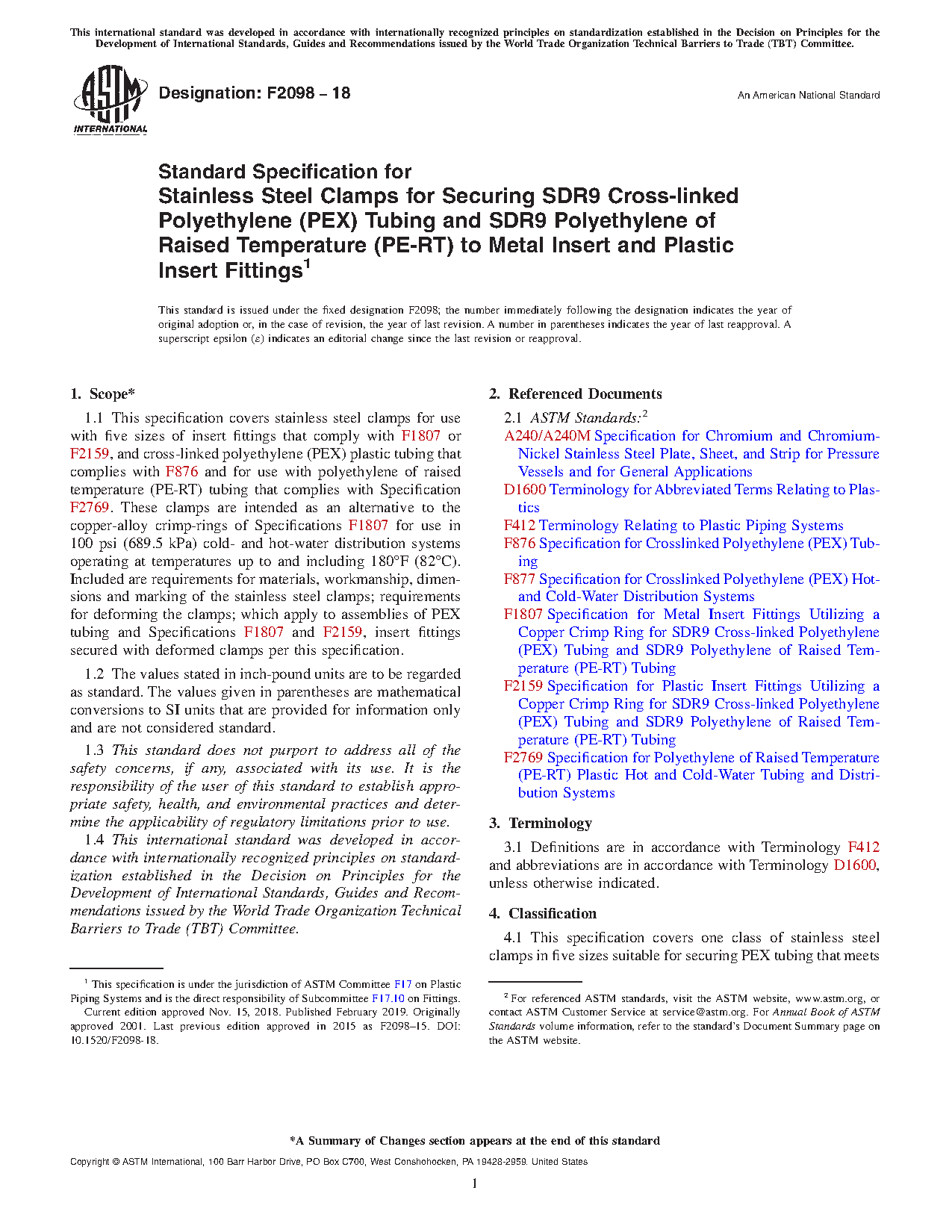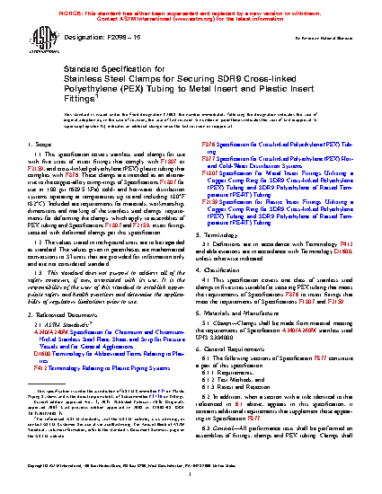 1.1 This specification covers stainless steel clamps for use with five sizes of insert fittings that comply with F1807 or F2159, and cross-linked polyethylene (PEX) plastic tubing that complies with F876 and for use with polyethylene of raised temperature (PE-RT) tubing that complies with Specification F2769. These clamps are intended as an alternative to the copper-alloy crimp-rings of Specifications F1807 for use in 100 psi (689.5 kPa) cold- and hot-water distribution systems operating at temperatures up to and including 180 °F (82 °C). Included are requirements for materials, workmanship, dimensions and marking of the stainless steel clamps; requirements for deforming the clamps; which apply to assemblies of PEX tubing and Specifications F1807 and F2159, insert fittings secured with deformed clamps per this specification.