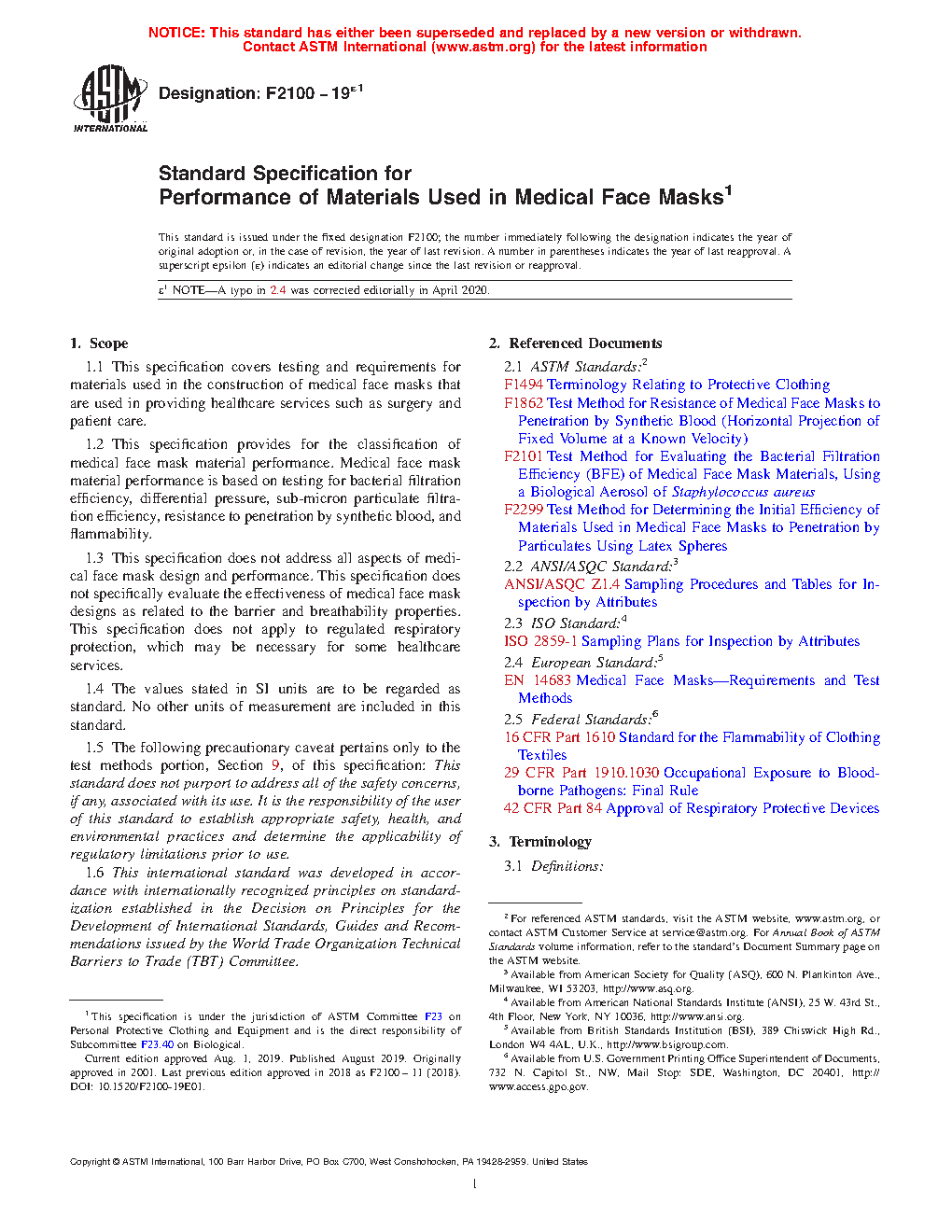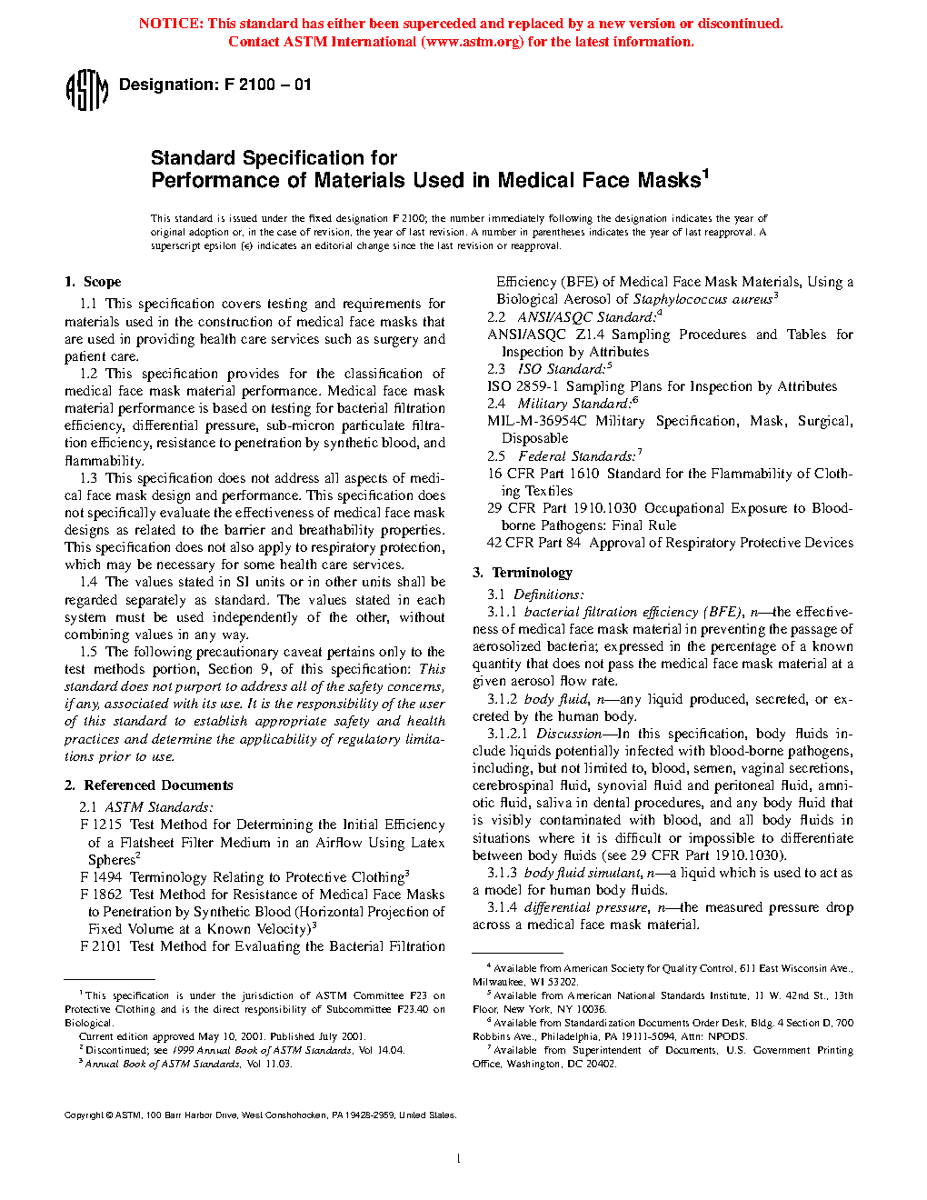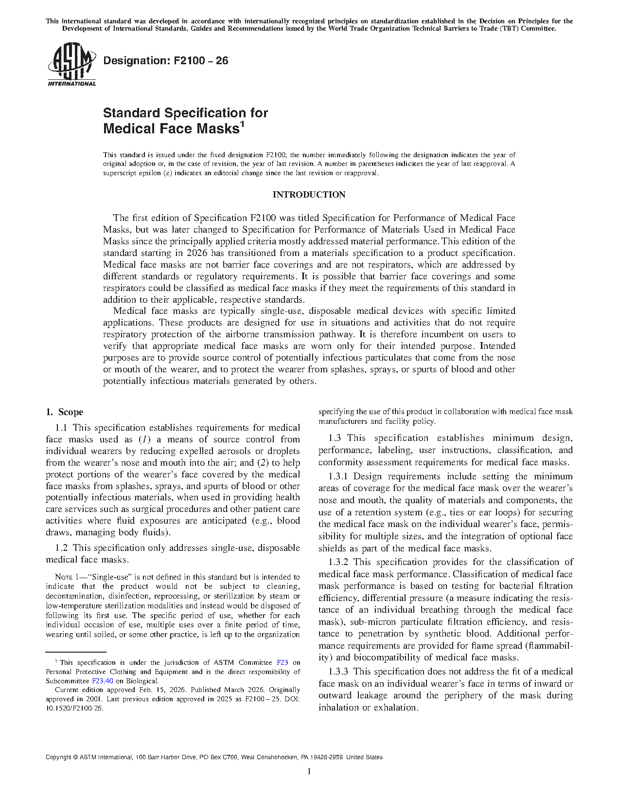 This specification covers the classifications, performance requirements, and test methods for the materials used in the construction of medical face masks that are used in health care services such as surgery and patient care. Medical face mask material performance is based on testing for bacterial filtration efficiency, differential pressure, sub-micron particulate filtration efficiency, resistance to penetration by synthetic blood, and flammability. This specification does not address all aspects of medical face mask design and performance, the effectiveness of medical face mask designs as related to the barrier and breathability properties, and respiratory protection, which may be necessary for some health care services.
