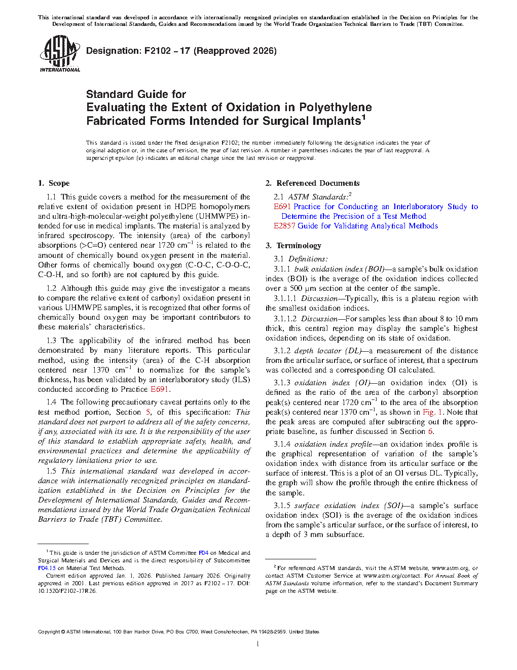 1.1 This guide covers a method for the measurement of the relative extent of oxidation present in ultra-high-molecular-weight polyethylene (UHMWPE) intended for use in medical implants. The material is analyzed by infrared spectroscopy. The intensity (area) of the carbonyl absorptions (>C=O) centered near 1720 cm-1 is related to the amount of chemically bound oxygen present in the material. Other forms of chemically bound oxygen (C-O-C, C-O-O-C, C-O-H, and so forth) are not captured by this guide.