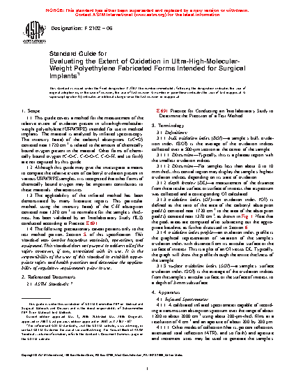 This guide covers method for evaluating the relative extent of oxidation in ultra-high-molecular-weight polyethylene fabricated forms intended for surgical implants. Equipments for this method shall include an infrared spectrometer, specimen holder, and microtome. Specimen shall be tested with infrared spectrometer in accordance to the procedure of test specimen preparation, spectrometer setup, and test specimen configuration. Oxidation peak area, normalization peak area, oxidation index, oxidation index depth locator, oxidation index profile, surface oxidation index, bulk oxidation index, and maximum oxidation index shall be calculated from the spectra. Report shall include material information, sample information, spectrometer information, and data analysis information.