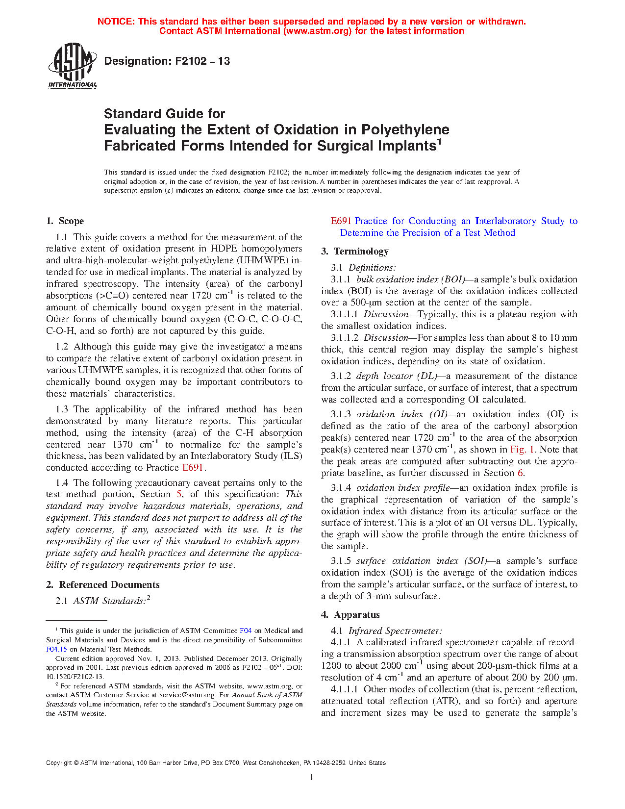 1.1 This guide covers a method for the measurement of the relative extent of oxidation present in HDPE homopolymers and ultra-high-molecular-weight polyethylene (UHMWPE) intended for use in medical implants. The material is analyzed by infrared spectroscopy. The intensity (area) of the carbonyl absorptions (>C=O) centered near 1720 cm-1 is related to the amount of chemically bound oxygen present in the material. Other forms of chemically bound oxygen (C-O-C, C-O-O-C, C-O-H, and so forth) are not captured by this guide.