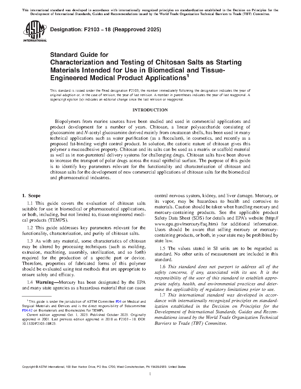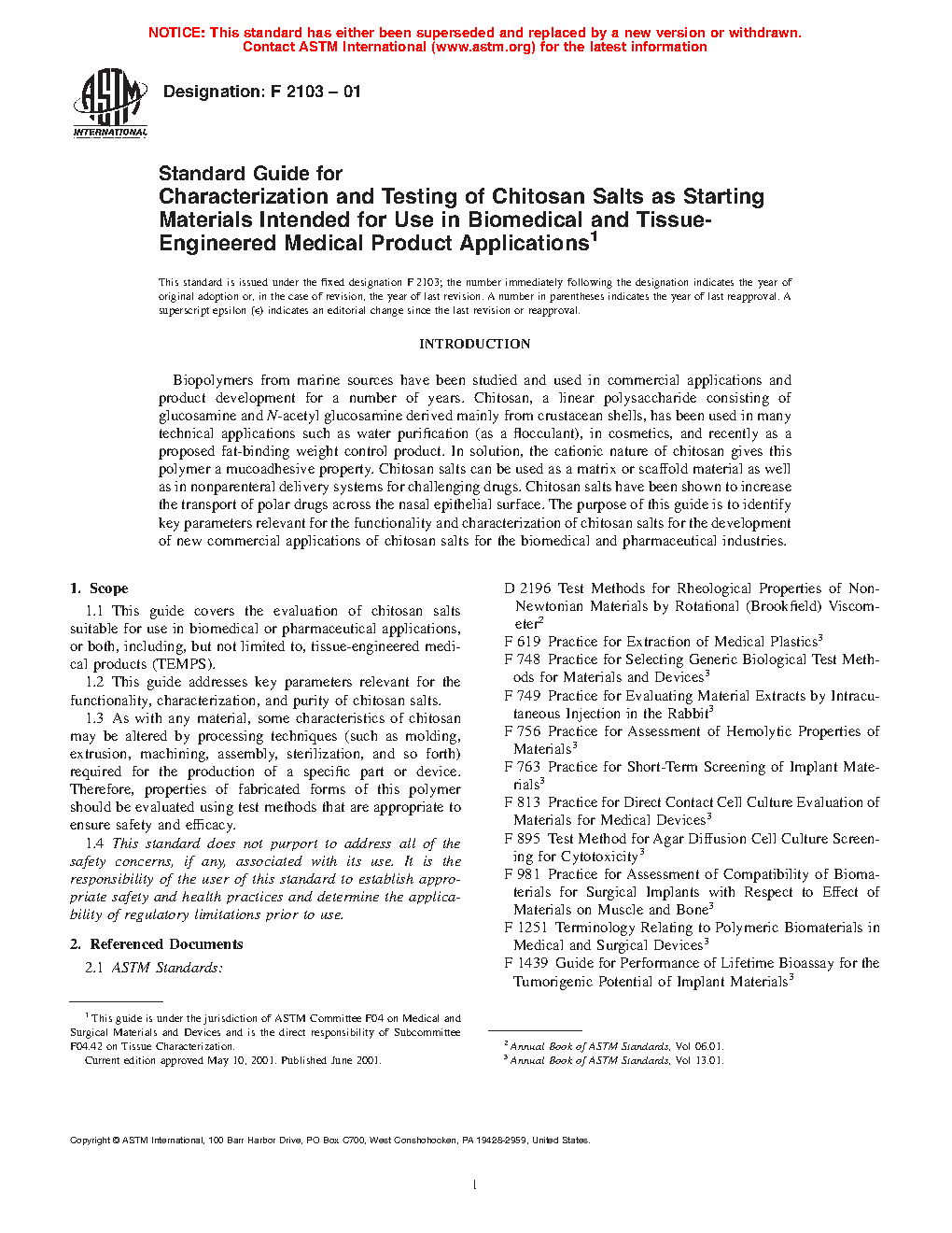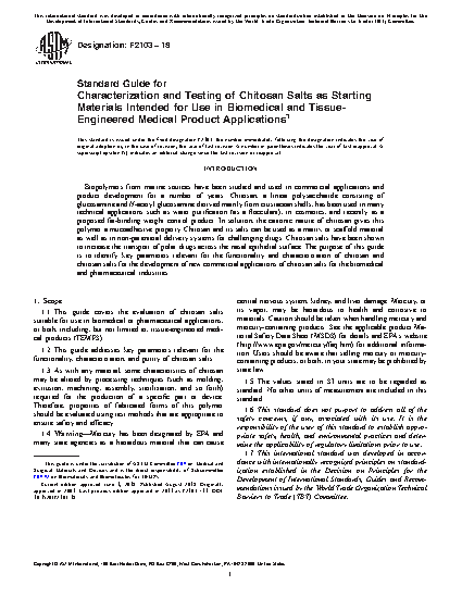 1.1 This guide covers the evaluation of chitosan salts suitable for use in biomedical or pharmaceutical applications, or both, including, but not limited to, tissue-engineered medical products (TEMPS).