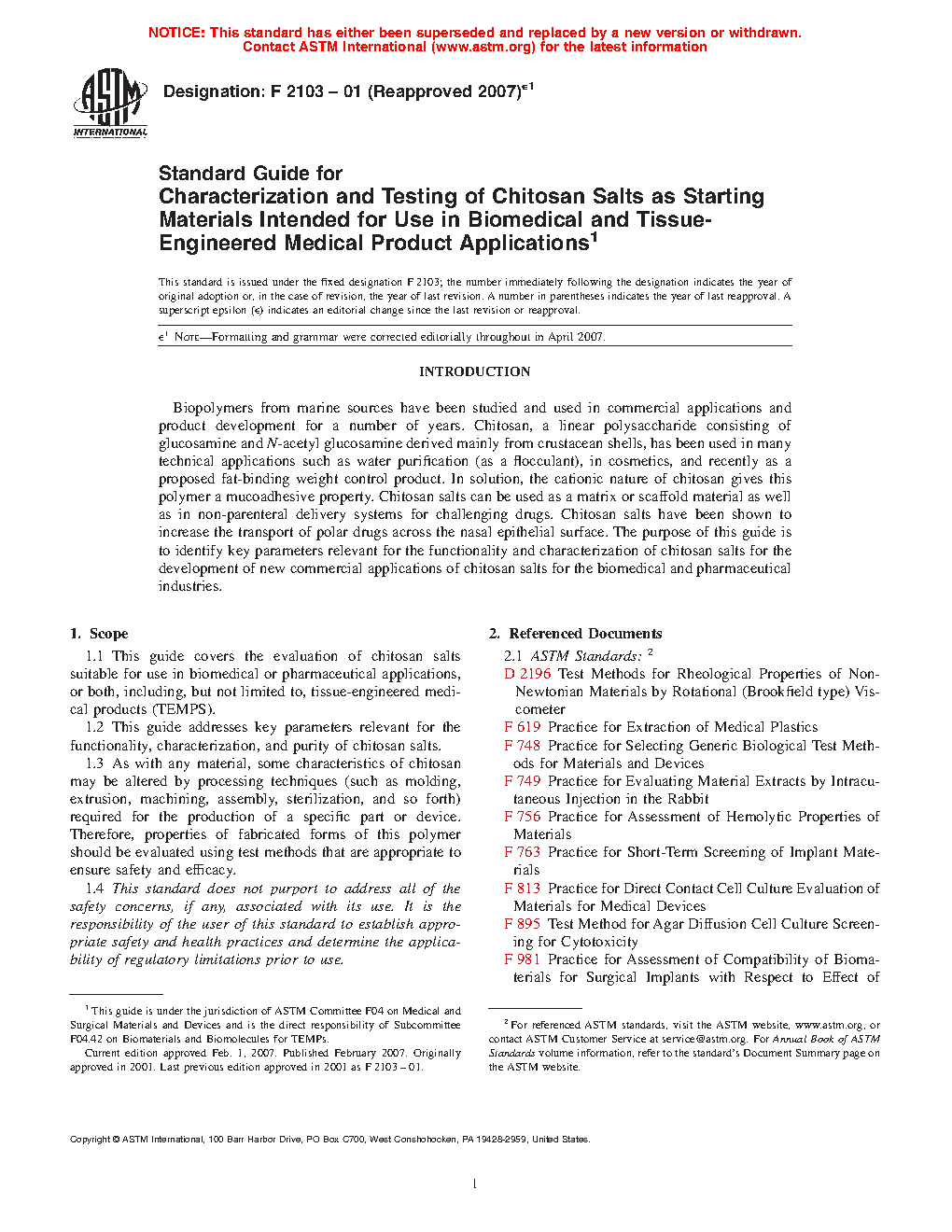 1.3 As with any material, some characteristics of chitosan may be altered by processing techniques (such as molding, extrusion, machining, assembly, sterilization, and so forth) required for the production of a specific part or device. Therefore, properties of fabricated forms of this polymer should be evaluated using test methods that are appropriate to ensure safety and efficacy.