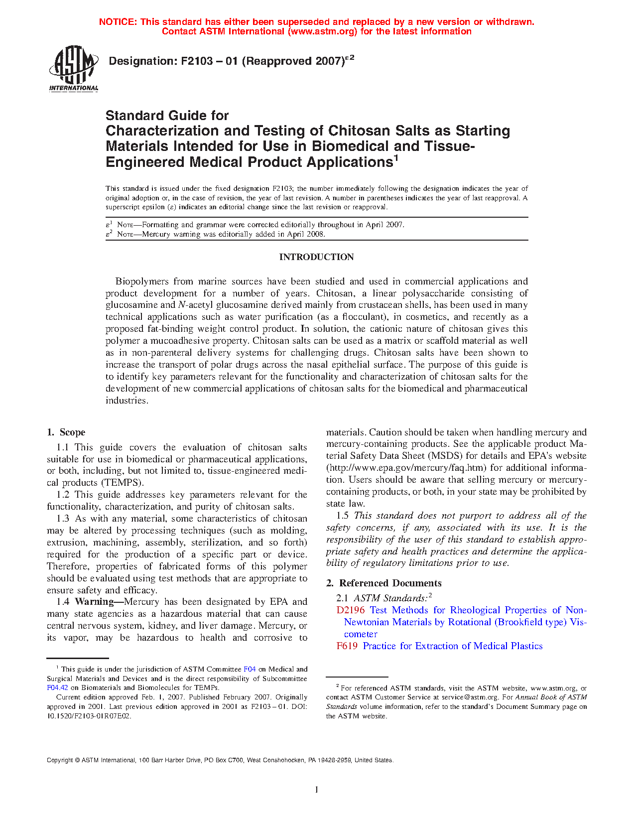 1.3 As with any material, some characteristics of chitosan may be altered by processing techniques (such as molding, extrusion, machining, assembly, sterilization, and so forth) required for the production of a specific part or device. Therefore, properties of fabricated forms of this polymer should be evaluated using test methods that are appropriate to ensure safety and efficacy.