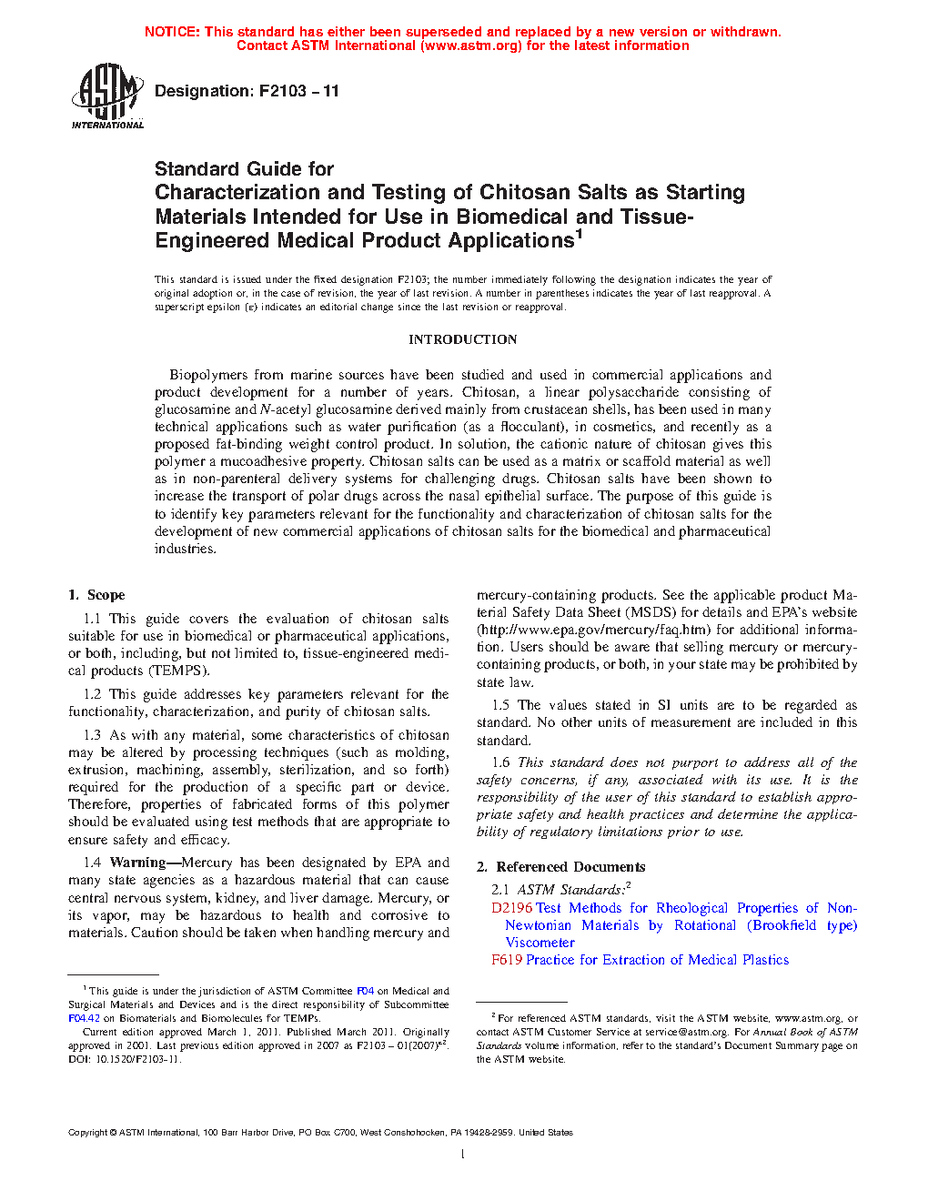 4.2 The chitosan salts covered by this guide may be gelled, extruded, or otherwise formulated into biomedical devices for use as tissue-engineered medical products or drug delivery devices for implantation as determined to be appropriate, based on supporting biocompatibility and physical test data. Recommendations in this guide should not be interpreted as a guarantee of clinical success in any tissue-engineered medical product or drug delivery application.
