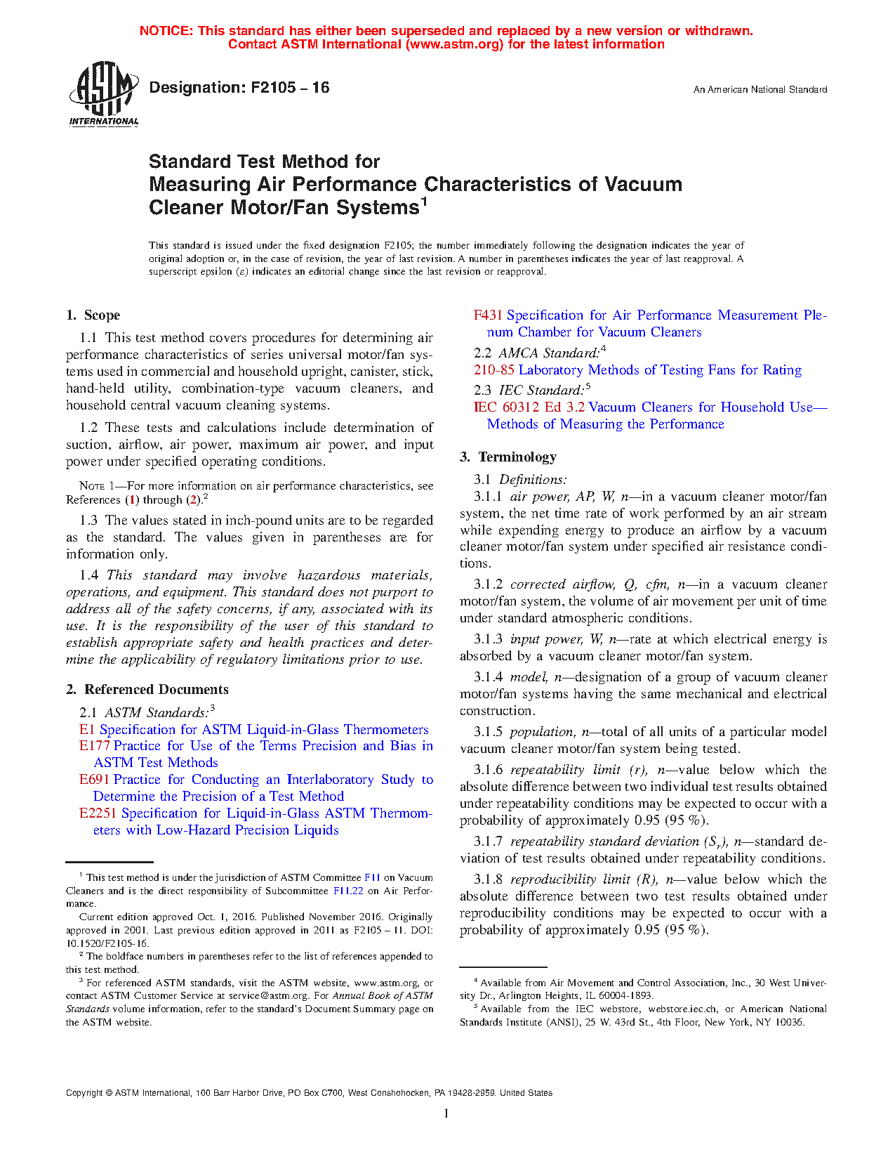 1.2 These tests and calculations include determination of suction, airflow, air power, maximum air power, and input power under specified operating conditions.