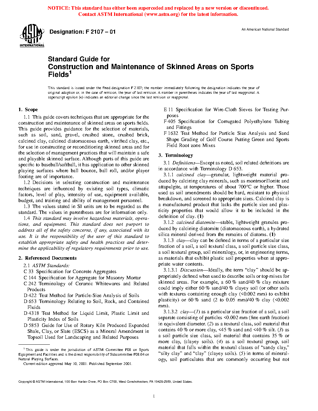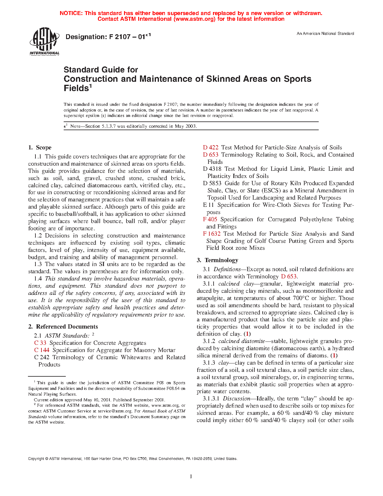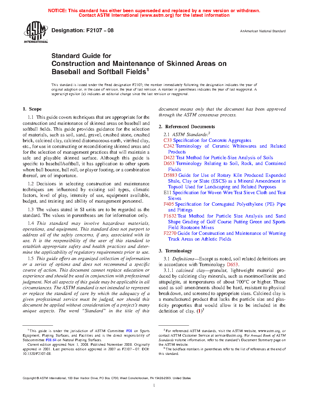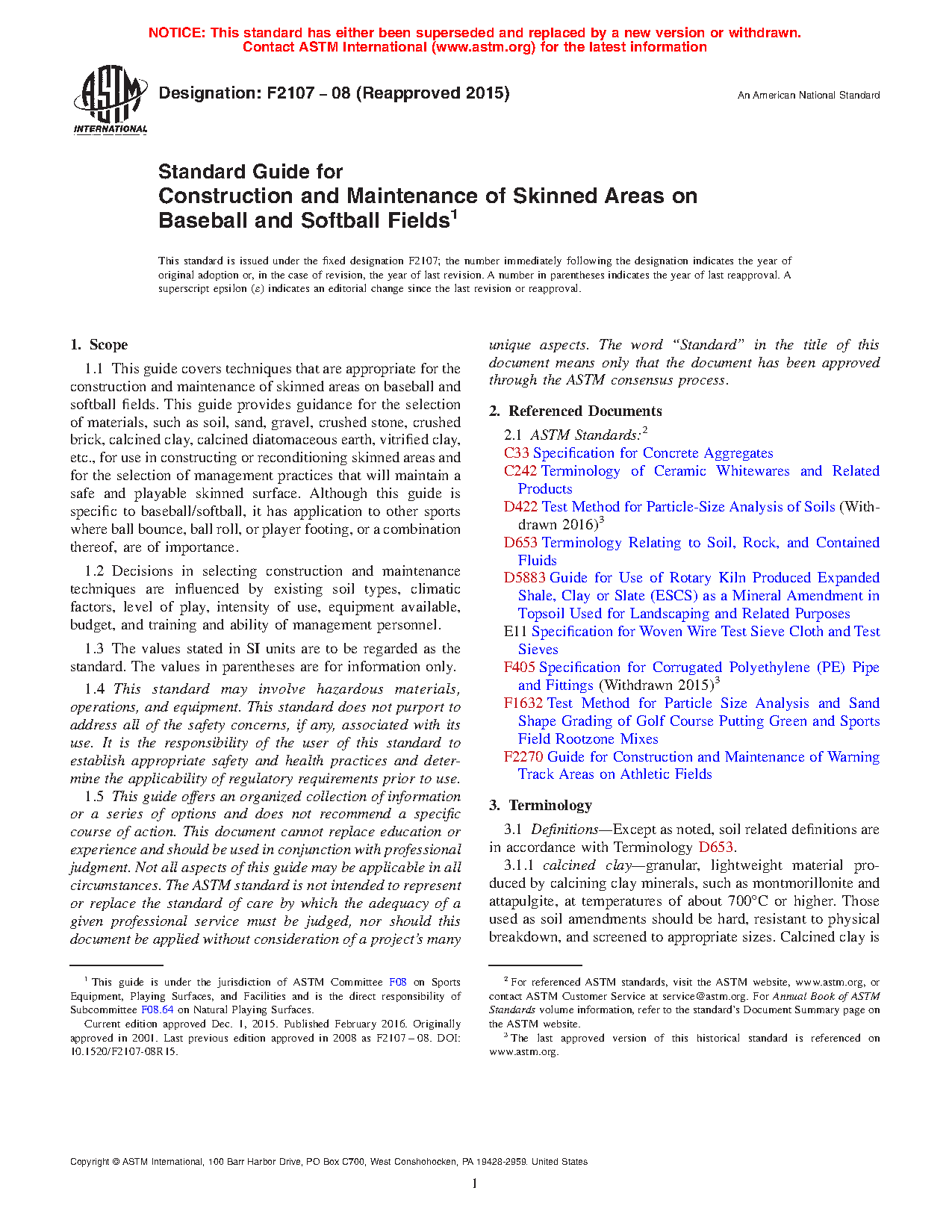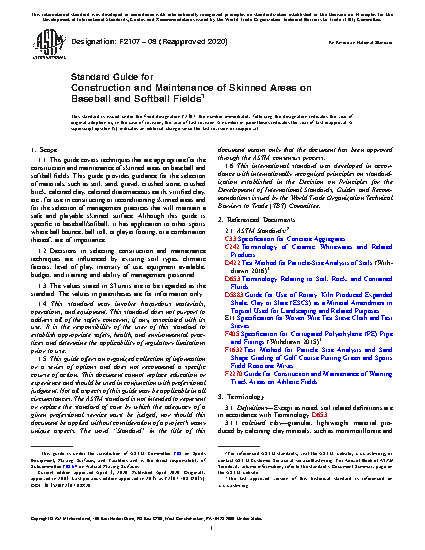 1.1 This guide covers techniques that are appropriate for the construction and maintenance of skinned areas on baseball and softball fields. This guide provides guidance for the selection of materials, such as soil, sand, gravel, crushed stone, crushed brick, calcined clay, calcined diatomaceous earth, vitrified clay, etc., for use in constructing or reconditioning skinned areas and for the selection of management practices that will maintain a safe and playable skinned surface. Although this guide is specific to baseball/softball, it has application to other sports where ball bounce, ball roll, or player footing, or a combination thereof, are of importance.