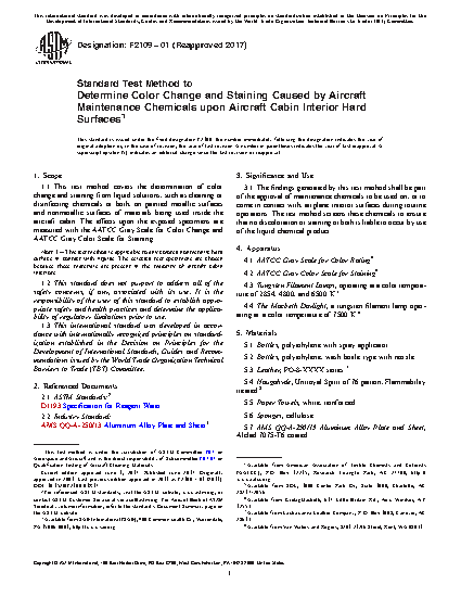1.1 This test method covers the determination of color change and staining from liquid solutions, such as cleaning or disinfecting chemicals or both, on painted metallic surfaces and nonmetallic surfaces of materials being used inside the aircraft cabin. The effects upon the exposed specimens are measured with the AATCC Gray Scale for Color Change and AATCC Gray Color Scale for Staining.