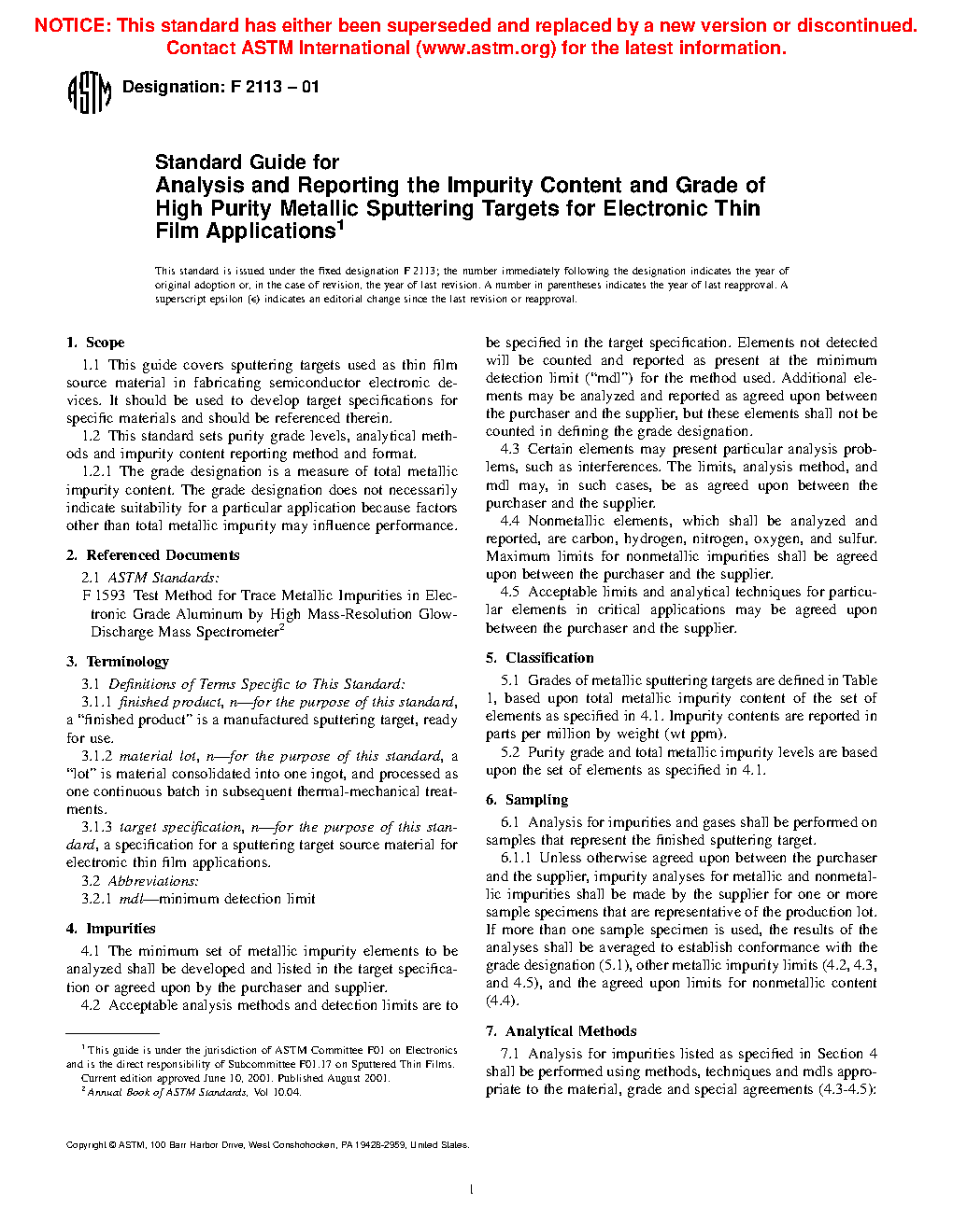This guide covers sputtering targets used as thin film source material in fabricating semiconductor electronic devices. It should be used to develop target specifications for specific materials. This standard sets purity grade levels, analytical methods and impurity content reporting method and format. The grade designation is a measure of total metallic impurity content. It does not necessarily indicate suitability for a particular application because factors other than total metallic impurity may influence performance. Analysis for trace metallic impurities and gases shall be performed on samples that represent the finished sputtering target. Carbon, oxygen, and sulfur shall be analysed by fusion and gas extraction/infrared spectroscopy. Nitrogen and hydrogen shall be analysed by fusion and gas extraction.