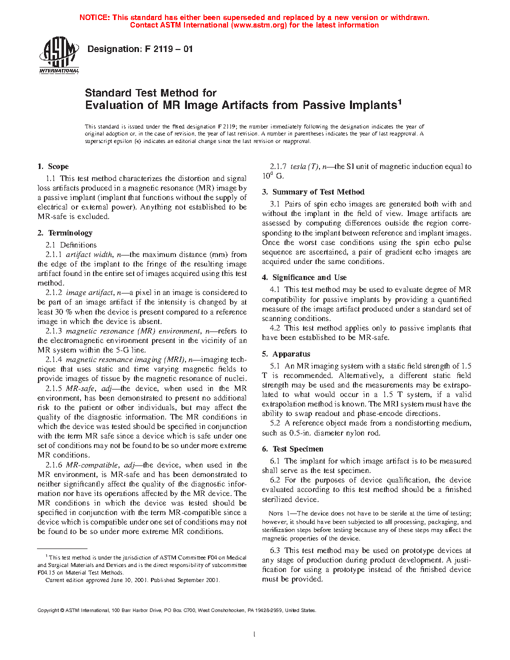 Standard Test Method for Evaluation of MR Image Artifacts from Passive Implants