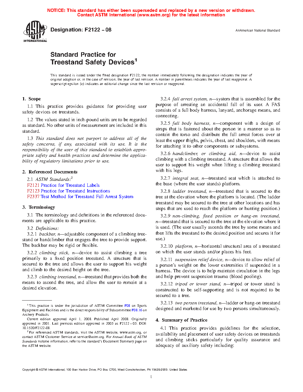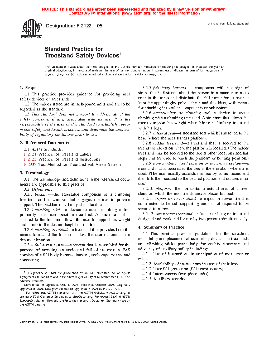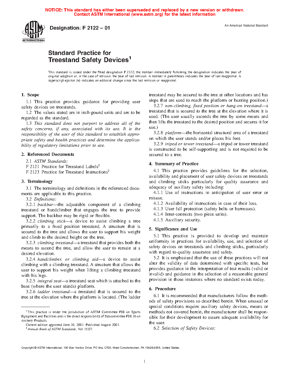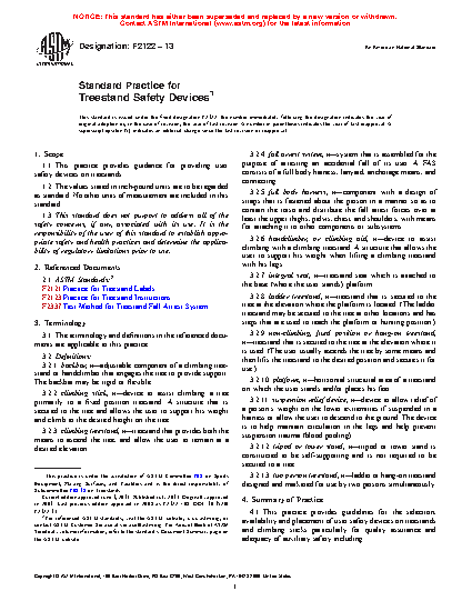 5.1 This practice is provided to develop and maintain uniformity in practices for availability, use, and selection of safety devices on treestands and climbing sticks, particularly with regard to quality assurance and safety.