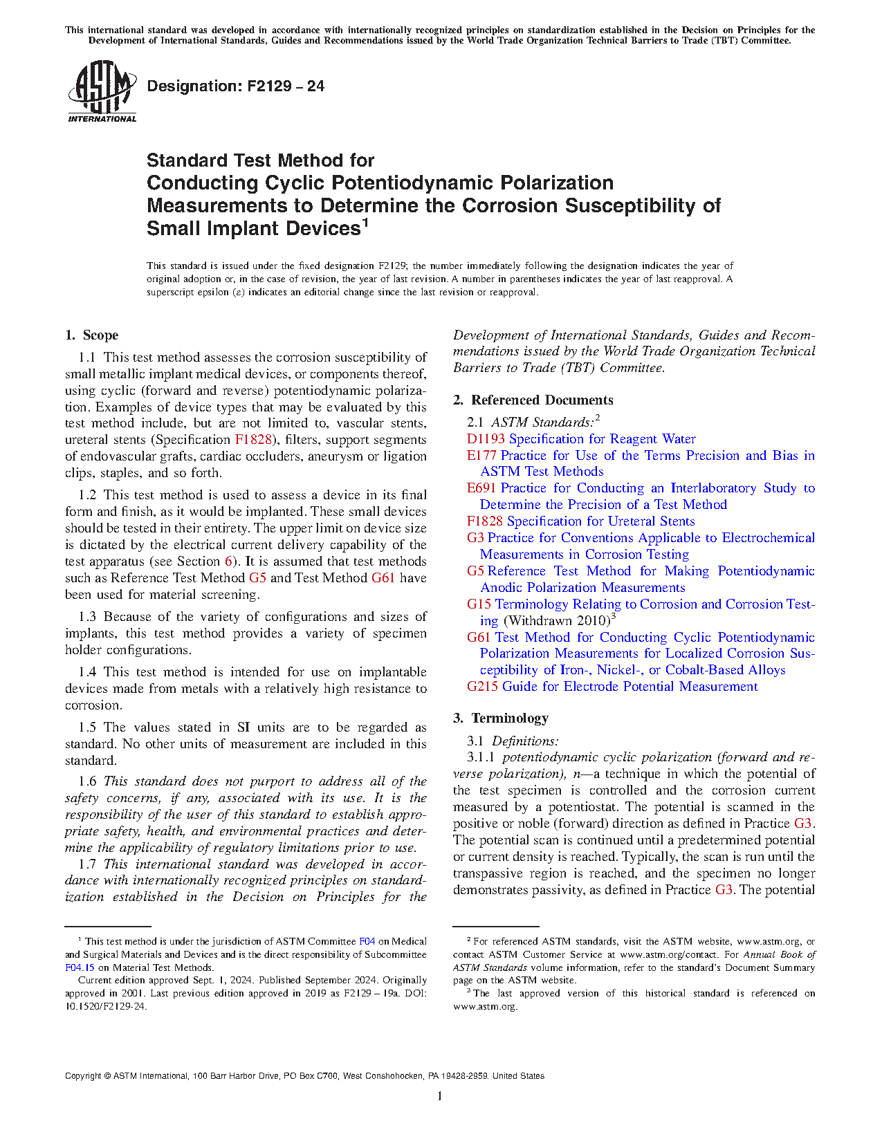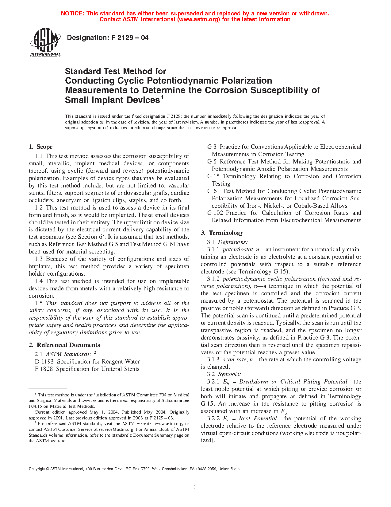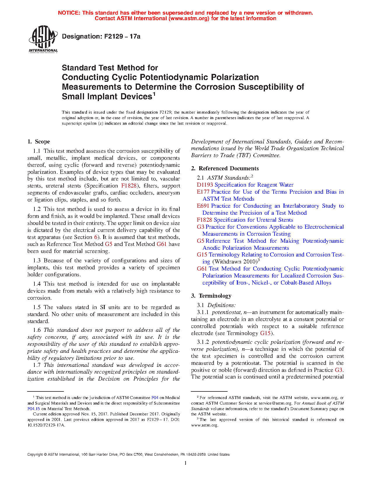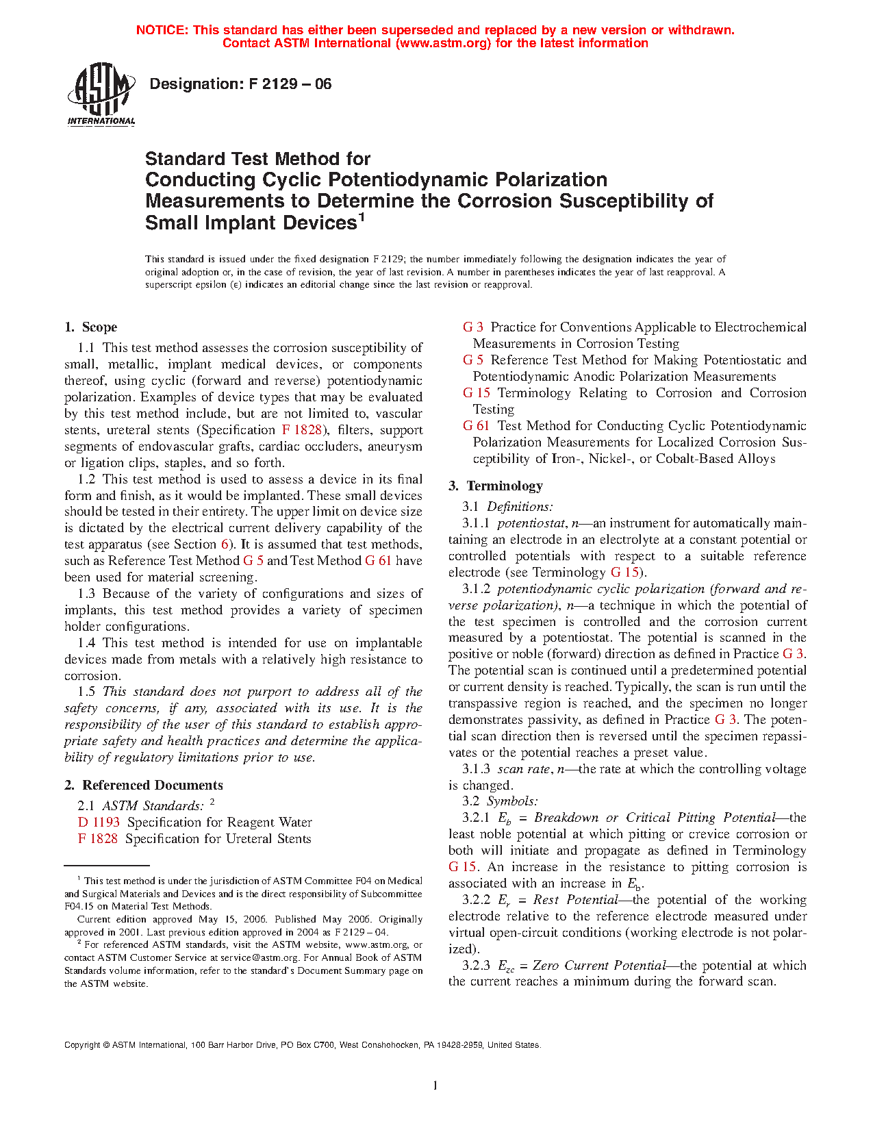 1.1 This test method assesses the corrosion susceptibility of small, metallic, implant medical devices, or components thereof, using cyclic (forward and reverse) potentiodynamic polarization. Examples of device types that may be evaluated by this test method include, but are not limited to, vascular stents, ureteral stents (Specification F1828), filters, support segments of endovascular grafts, cardiac occluders, aneurysm or ligation clips, staples, and so forth.