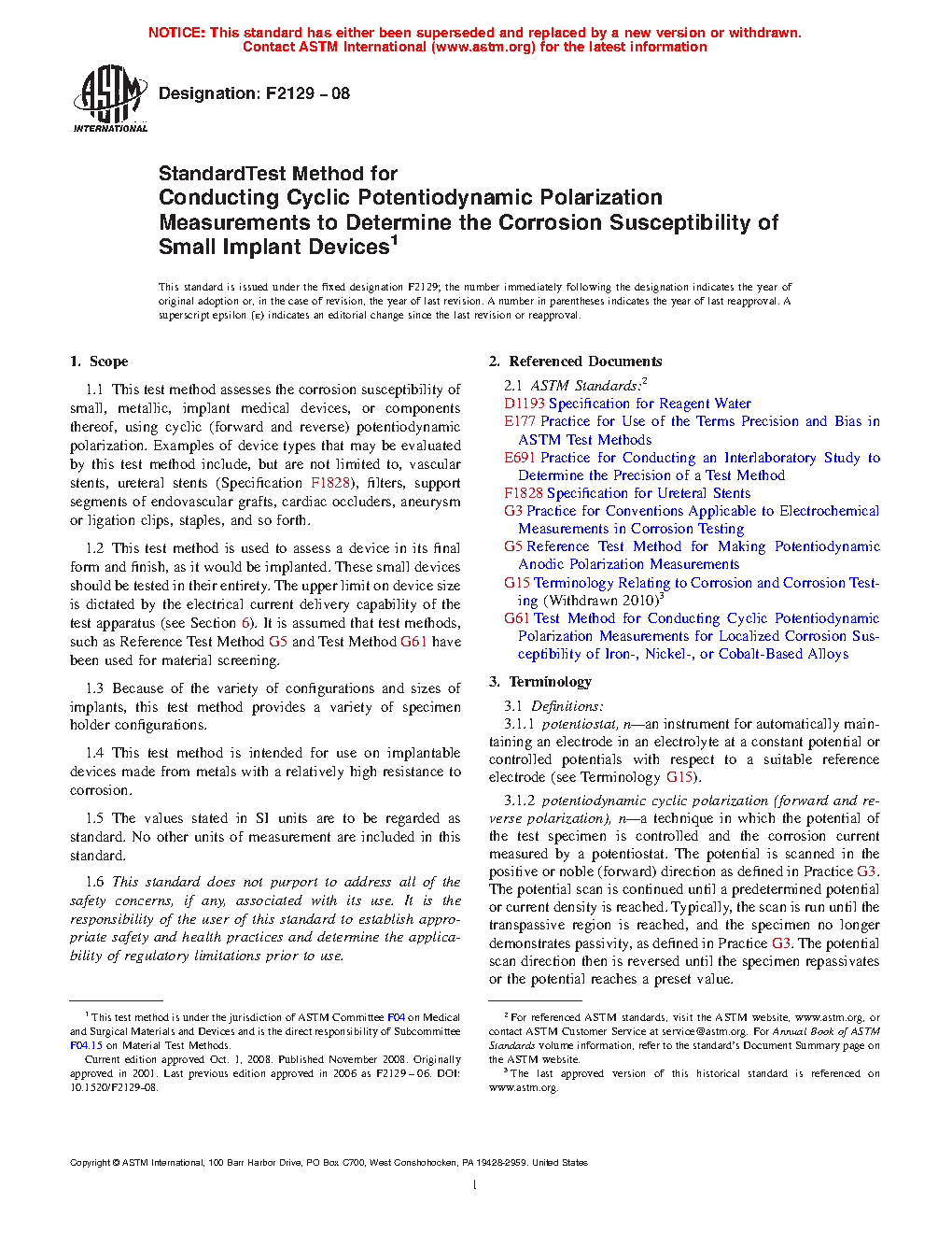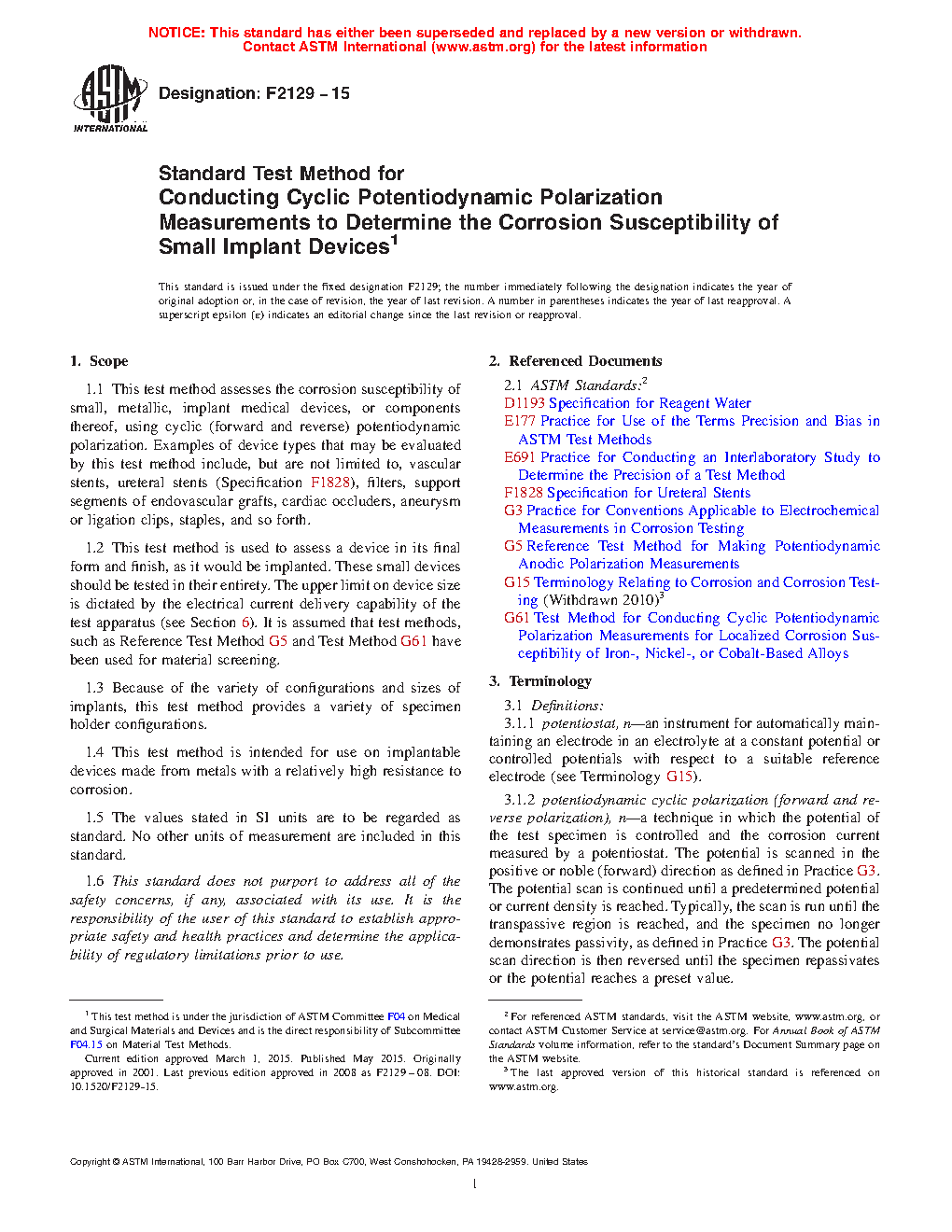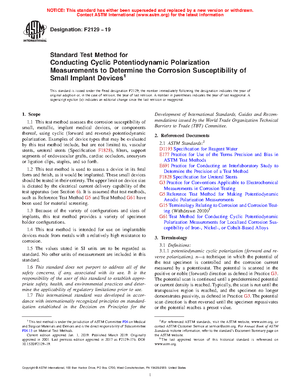 1.1 This test method assesses the corrosion susceptibility of small, metallic, implant medical devices, or components thereof, using cyclic (forward and reverse) potentiodynamic polarization. Examples of device types that may be evaluated by this test method include, but are not limited to, vascular stents, ureteral stents (Specification F1828), filters, support segments of endovascular grafts, cardiac occluders, aneurysm or ligation clips, staples, and so forth.