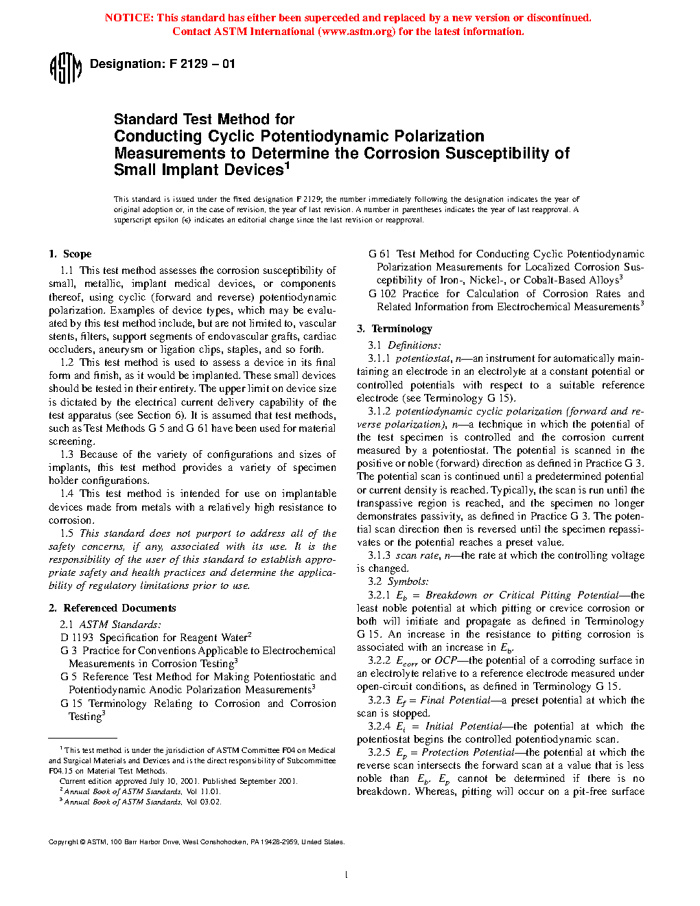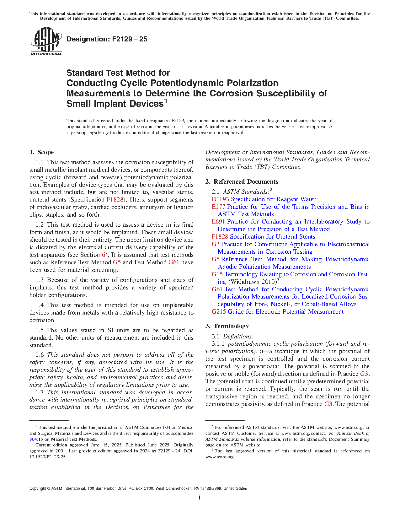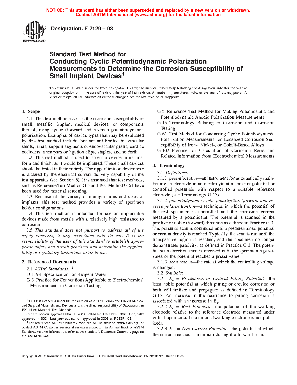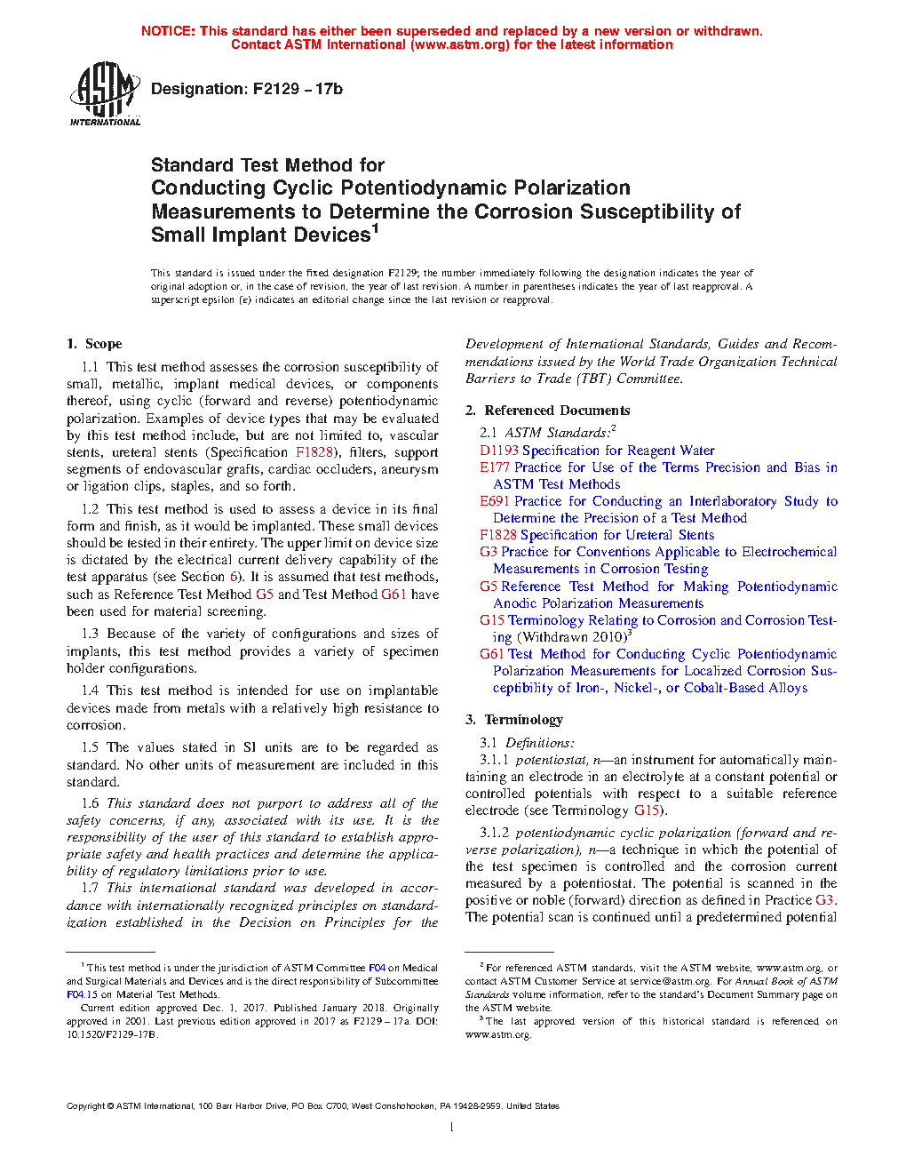 1.1 This test method assesses the corrosion susceptibility of small, metallic, implant medical devices, or components thereof, using cyclic (forward and reverse) potentiodynamic polarization. Examples of device types that may be evaluated by this test method include, but are not limited to, vascular stents, ureteral stents (Specification F1828), filters, support segments of endovascular grafts, cardiac occluders, aneurysm or ligation clips, staples, and so forth.