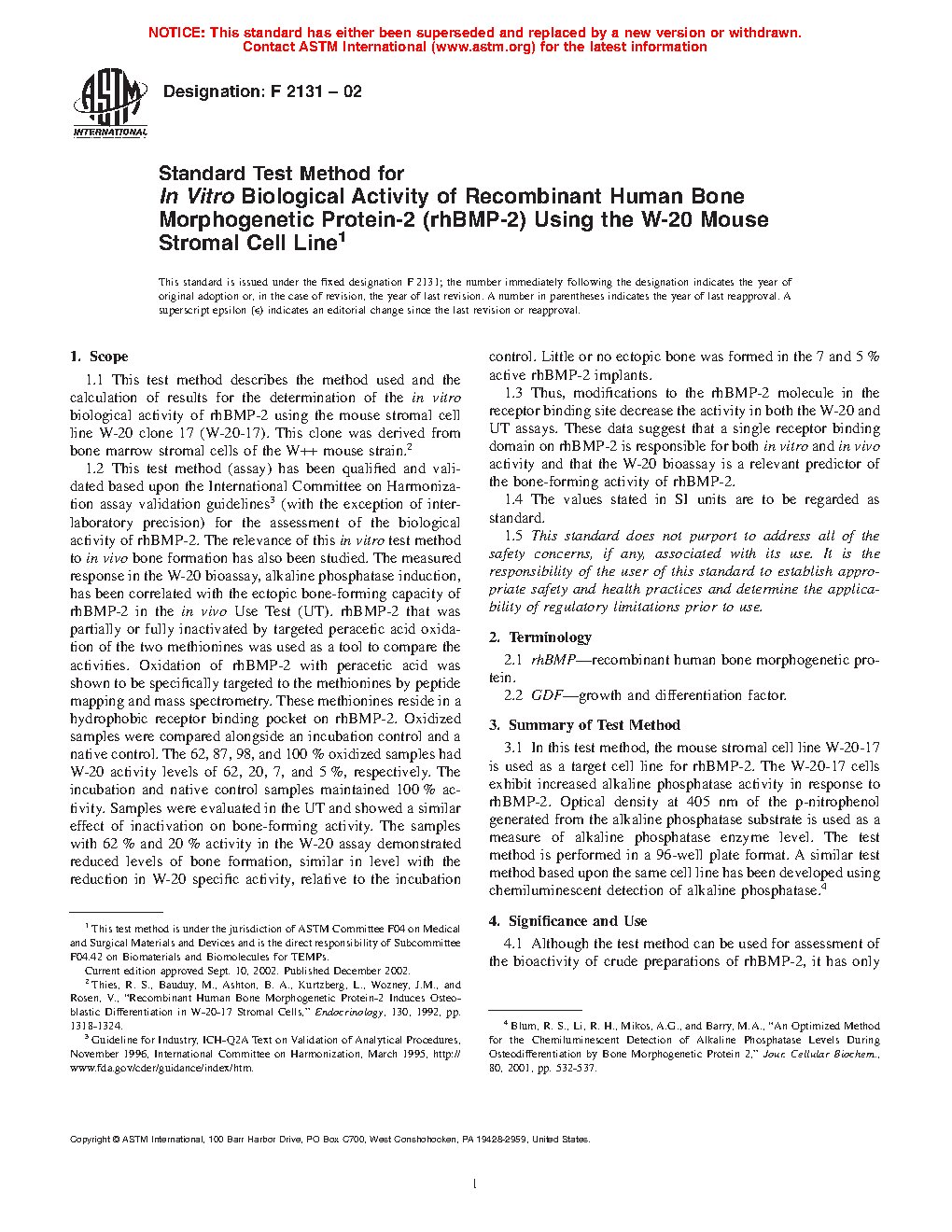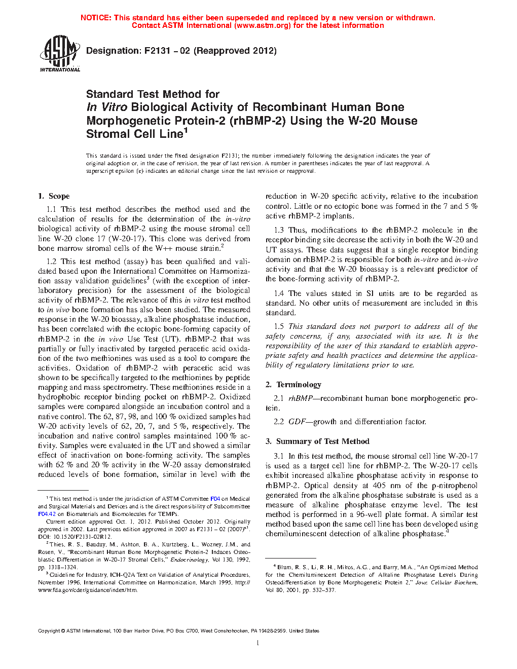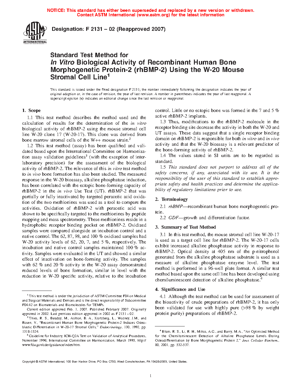 1.1 This test method describes the method used and the calculation of results for the determination of the in vitro biological activity of rhBMP-2 using the mouse stromal cell line W-20 clone 17 (W-20-17). This clone was derived from bone marrow stromal cells of the W++ mouse strain.