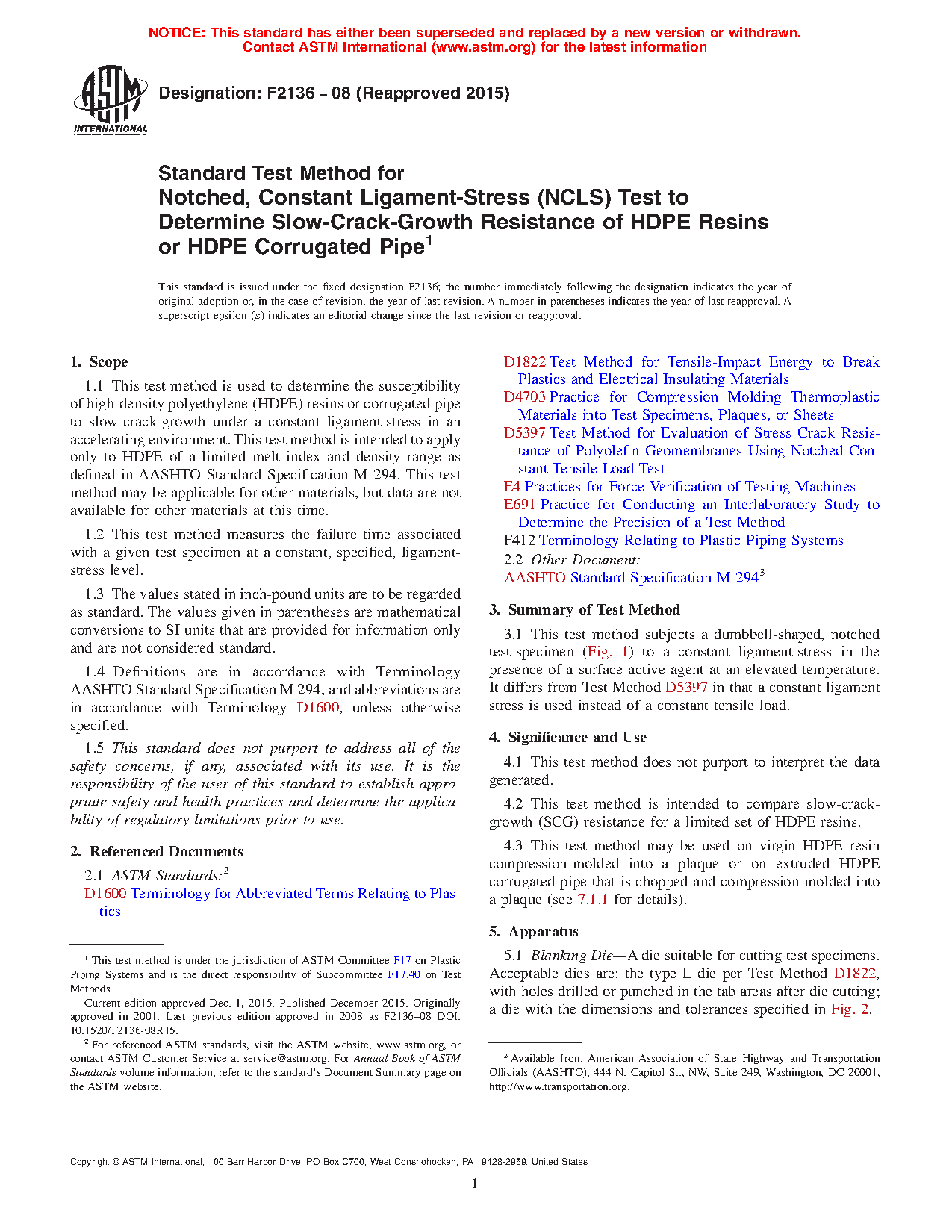 1.1 This test method is used to determine the susceptibility of high-density polyethylene (HDPE) resins or corrugated pipe to slow-crack-growth under a constant ligament-stress in an accelerating environment. This test method is intended to apply only to HDPE of a limited melt index and density range as defined in AASHTO Standard Specification M 294. This test method may be applicable for other materials, but data are not available for other materials at this time.