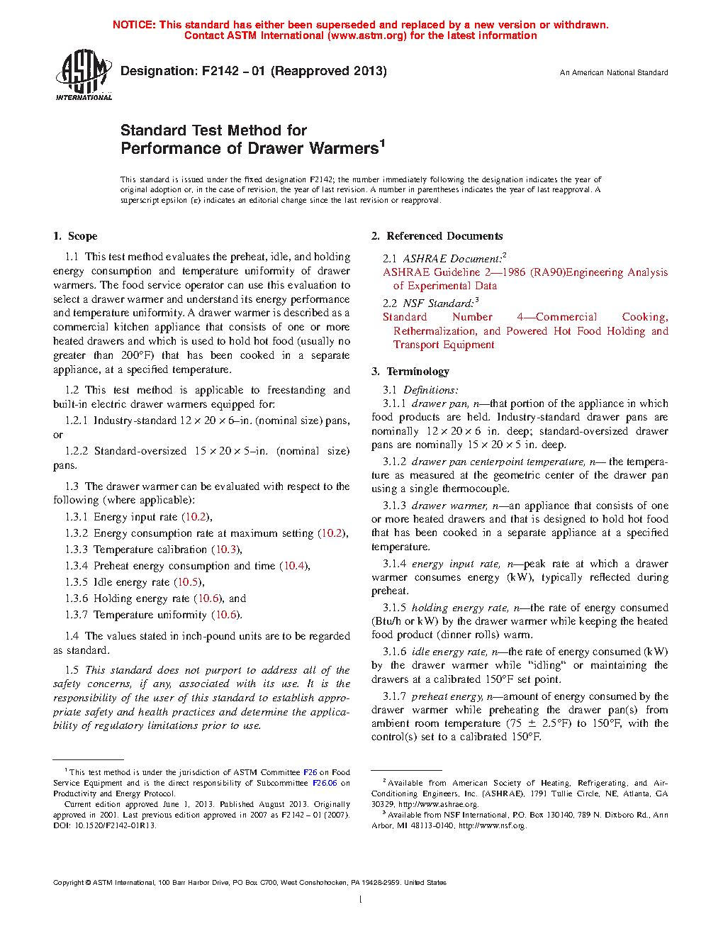1.1 This test method evaluates the preheat, idle, and holding energy consumption and temperature uniformity of drawer warmers. The food service operator can use this evaluation to select a drawer warmer and understand its energy performance and temperature uniformity. A drawer warmer is described as a commercial kitchen appliance that consists of one or more heated drawers and which is used to hold hot food (usually no greater than 200°F) that has been cooked in a separate appliance, at a specified temperature.