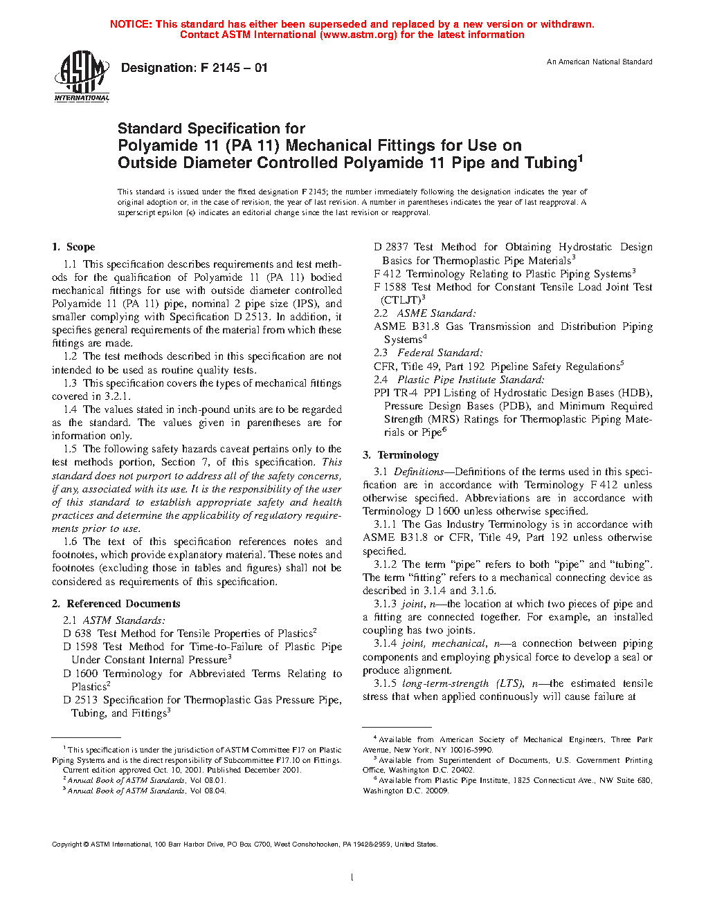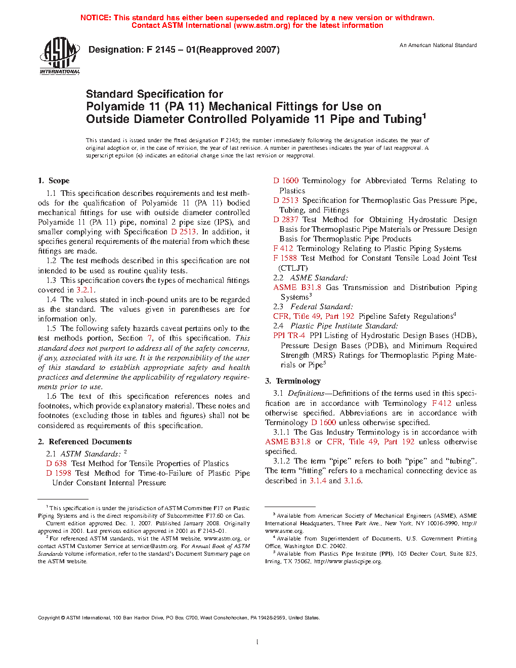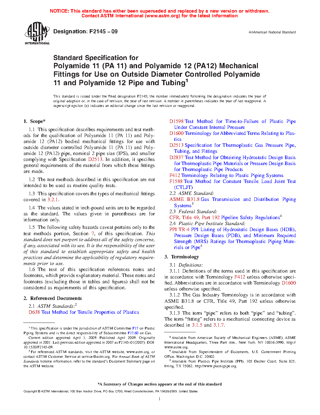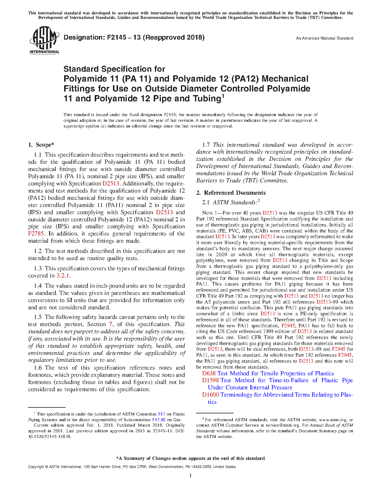 1.1 This specification describes requirements and test methods for the qualification of Polyamide 11 (PA 11) bodied mechanical fittings for use with outside diameter controlled Polyamide 11 (PA 11), nominal 2 pipe size (IPS), and smaller complying with Specification D2513. Additionally, the requirements and test methods for the qualification of Polyamide 12 (PA12) bodied mechanical fittings for use with outside diameter controlled Polyamide 11 (PA11) nominal 2 in pipe size (IPS) and smaller complying with Specification D2513 and outside diameter controlled Polyamide 12 (PA12) nominal 2 in pipe size (IPS) and smaller complying with Specification F2785. In addition, it specifies general requirements of the material from which these fittings are made.