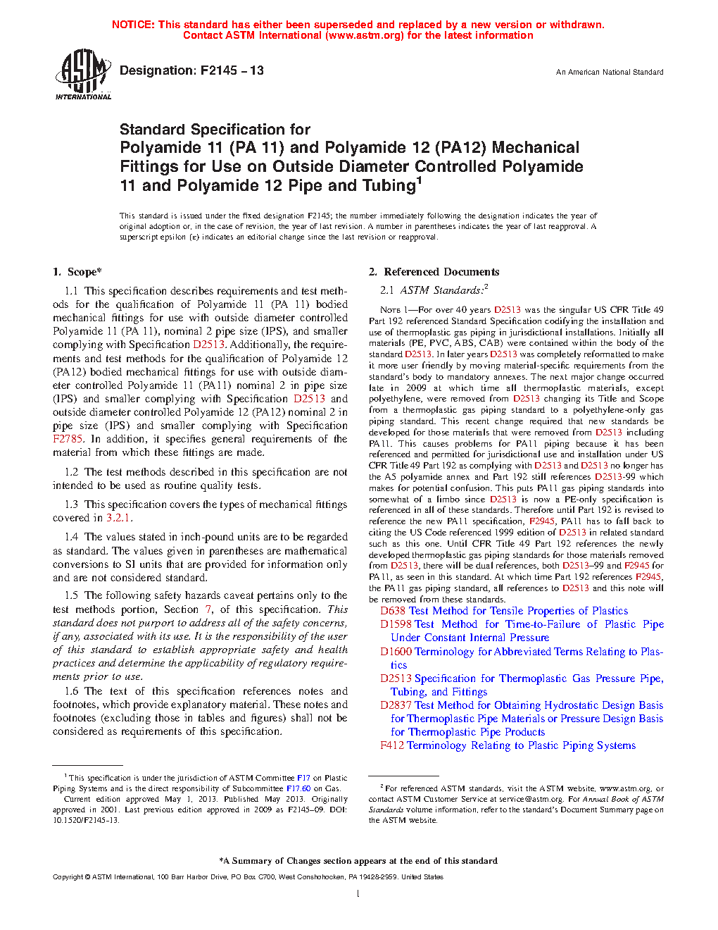 1.1 This specification describes requirements and test methods for the qualification of Polyamide 11 (PA 11) and Polyamide 12 (PA 12) bodied mechanical fittings for use with outside diameter controlled PA 11, nominal 2 pipe size (IPS), and smaller complying with Specification F2945, and PA 12, nominal 2 pipe size (IPS), and smaller complying with Specification F2785. In addition, it specifies general requirements of the material from which these fittings are made.