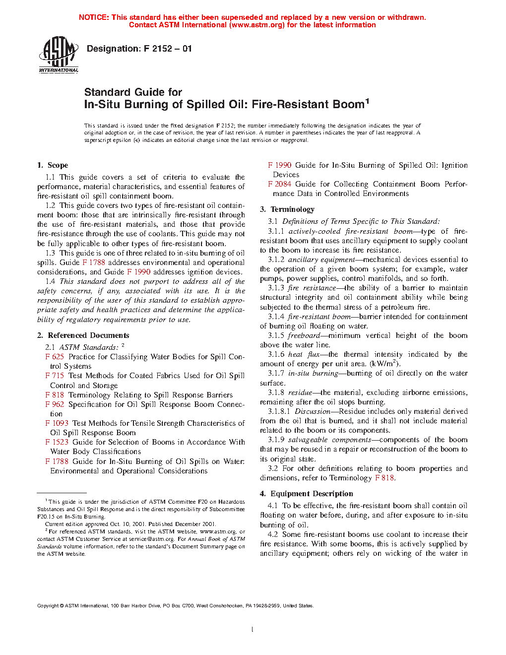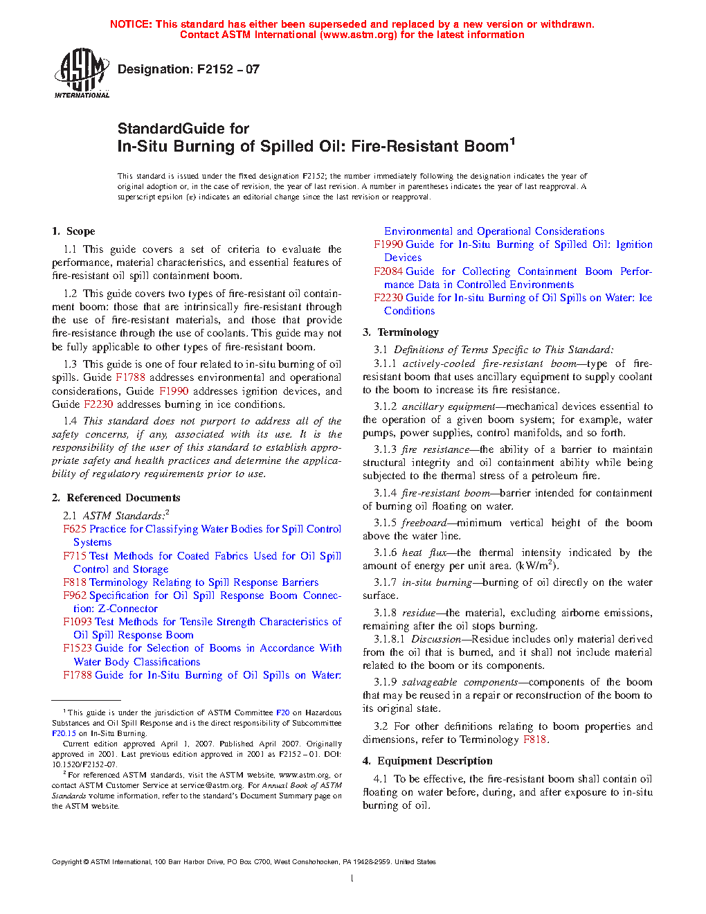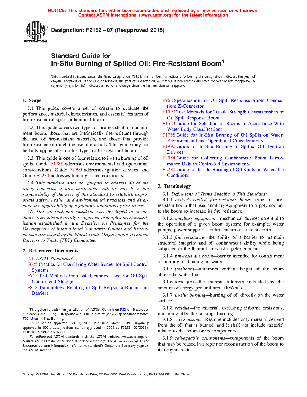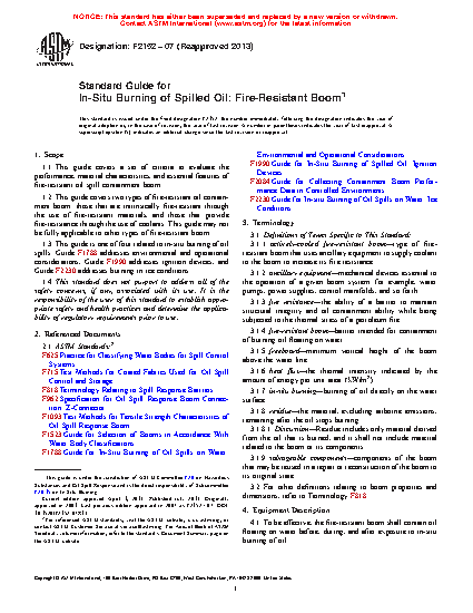 This guide covers a set of criteria to evaluate the performance, material characteristics, and essential features of fire-resistant oil spill containment boom. Two types of fire-resistant oil containment Boom are covered: those that are intrinsically fire-resistant through the use of fire-resistant materials, and those that provide fire-resistance through the use of coolants. The boom shall be tested for operability, oil containment, and fire resistance.