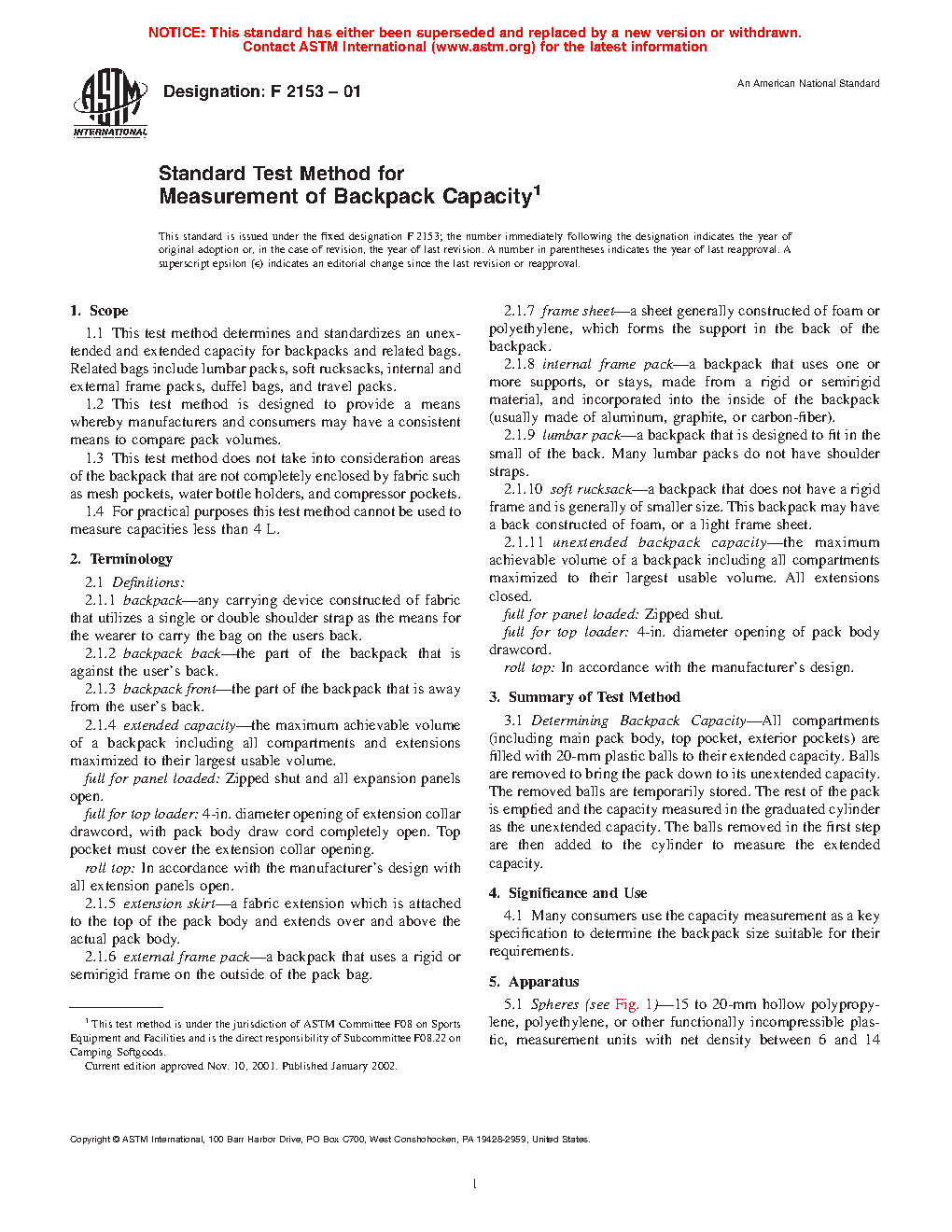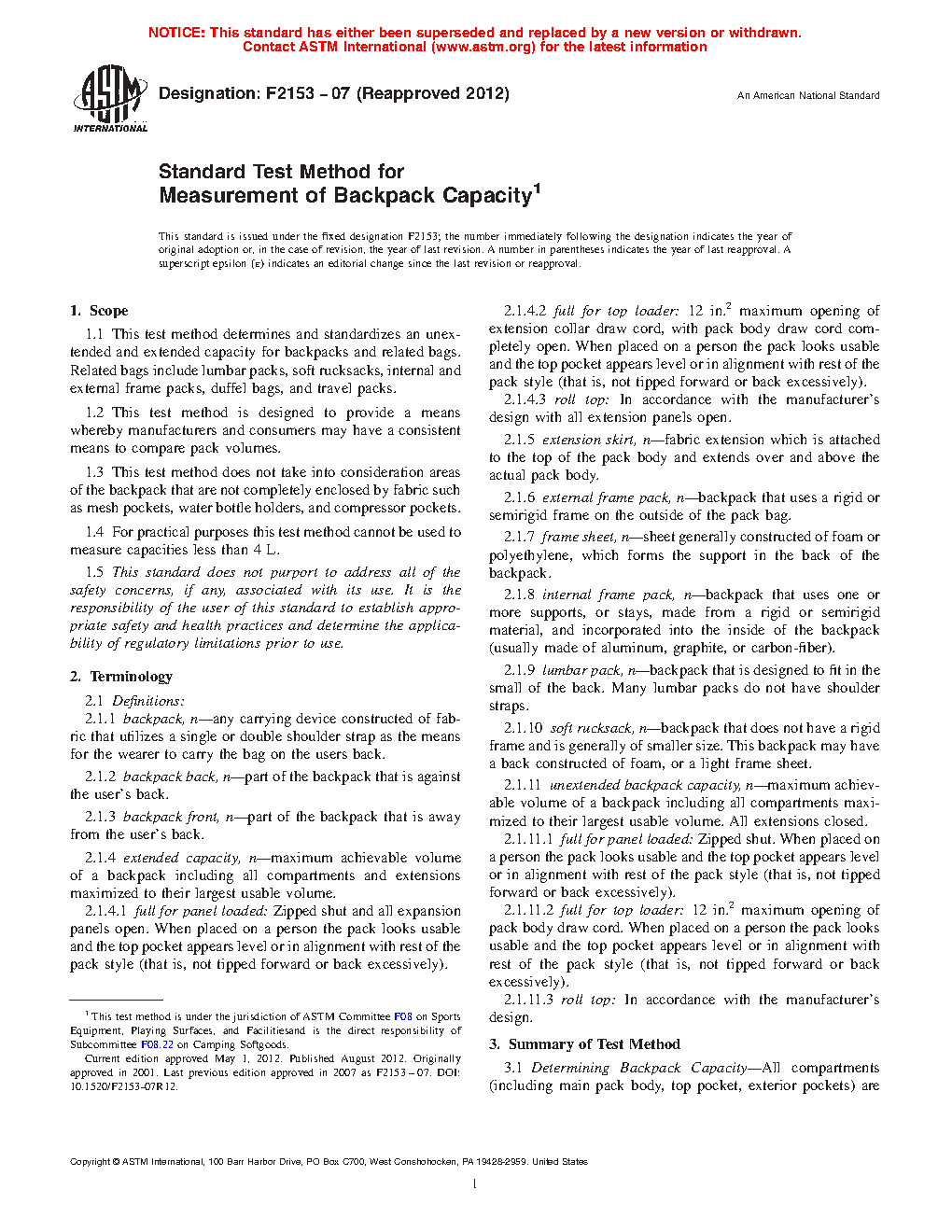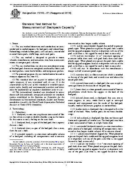 1.1 This test method determines and standardizes an unextended and extended capacity for backpacks and related bags. Related bags include lumbar packs, soft rucksacks, internal and external frame packs, duffel bags, and travel packs.