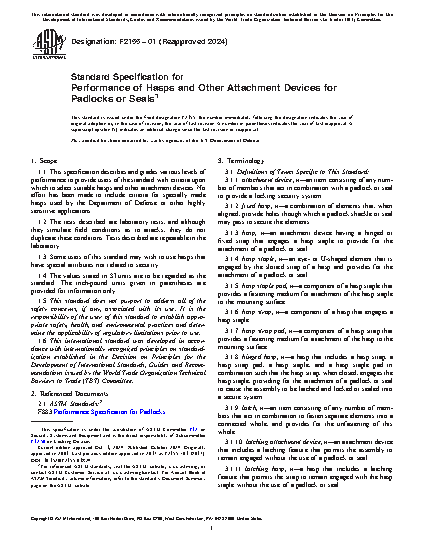 1.1 This specification describes and grades various levels of performance to provide users of the standard with criteria upon which to select suitable hasps and other attachment devices. No effort has been made to include criteria for specially made hasps used by the Department of Defense or other highly sensitive applications.